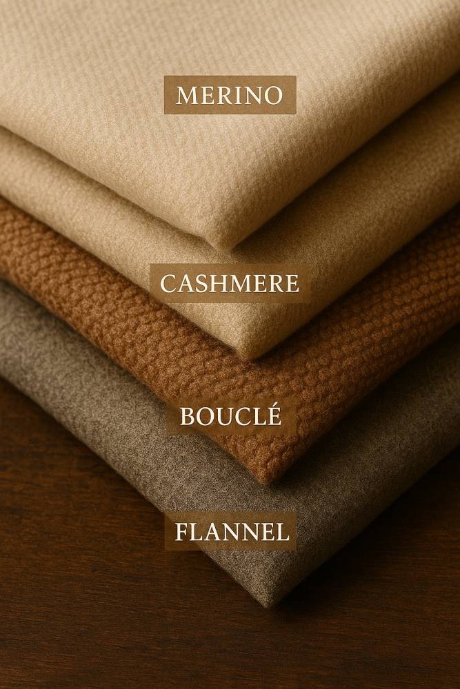 Tweed és flanel: kártolt gyapjúból készült szövetek, melyek sportos zakók, téli nadrágok, kabátok. blézerek alapanyagai.