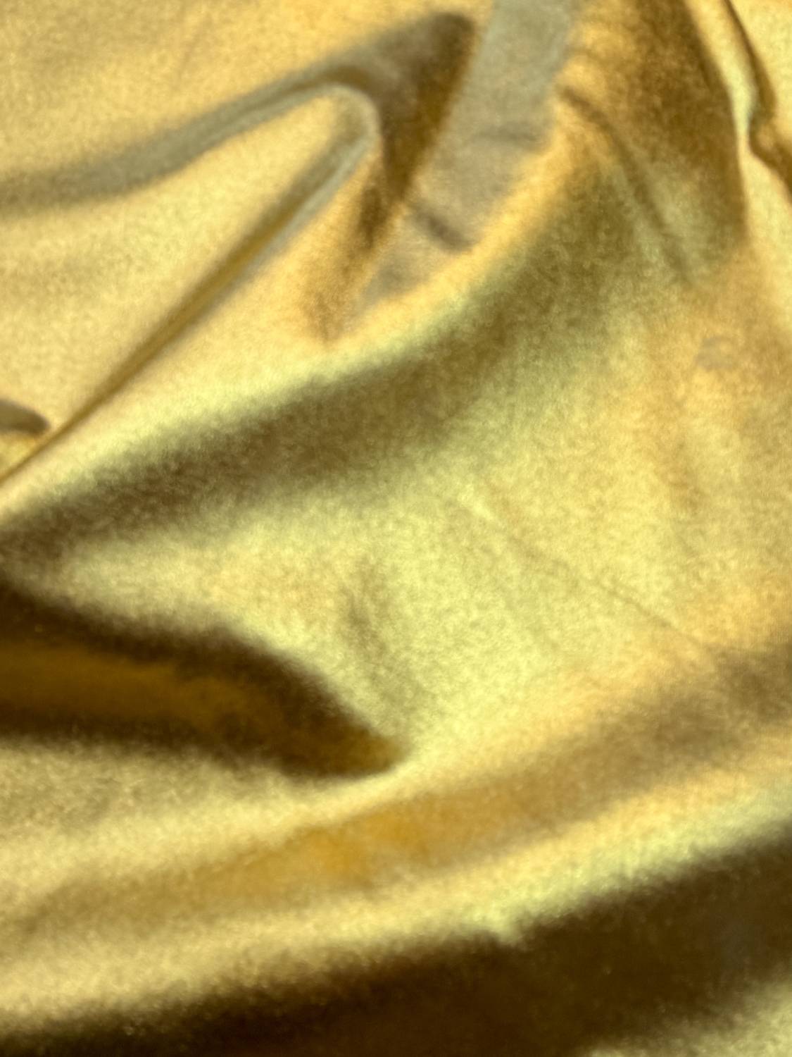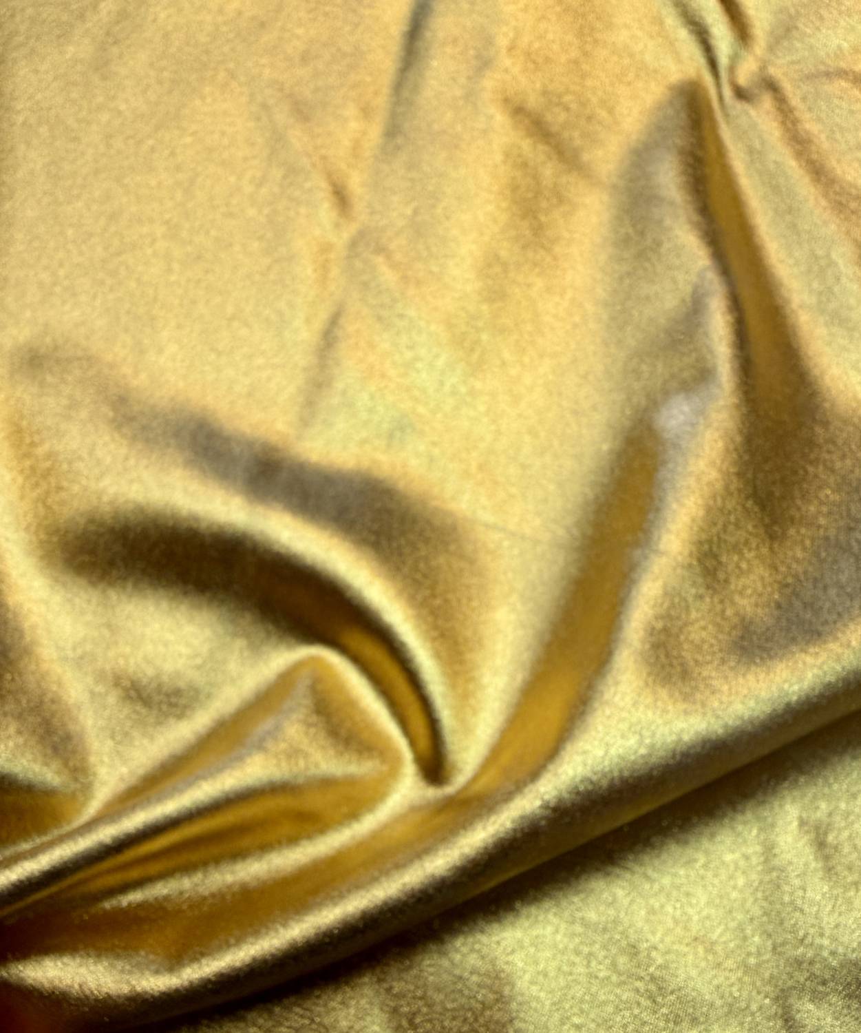 Különlegesen rugalmas, minden irányban elasztikus prémium anyag finom, elegáns arany fénnyel. Lágy esésű, kellemes tapintású, nem túl vastag textil, amely a mozgást követi, így egyszerre látványos és komfortos viseletet biztosít. Fényjátéka ünnepélyes, mégis modern megjelenést ad, ideális elegáns és alkalmi ruhadarabokhoz.