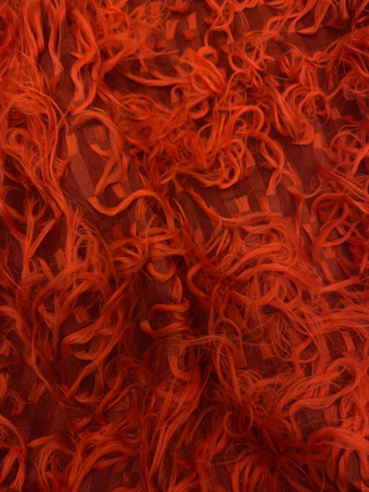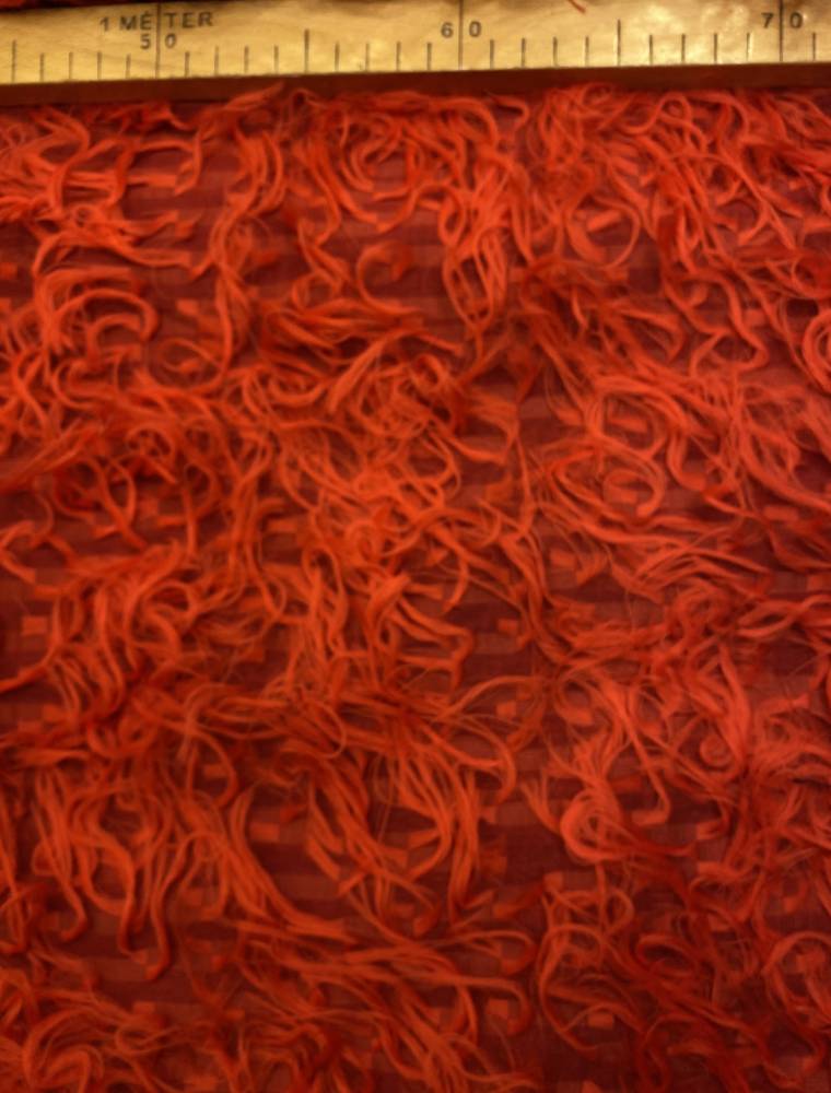 Különleges, áttört lángvörös textil alapra rögzített, játékos, hosszabb szálakkal díszített anyag. Látványos, bohém hatást keltő textília. Könnyed, mégis látványos szerkezete kiemeli a szabásvonalakat, és különleges textúrát ad a ruhának. Feltűnő és látványos ruhadarabok, például divatos kabátok, dzsekik, táncruhák vagy extravagáns kiegészítők készíthetők belőle.