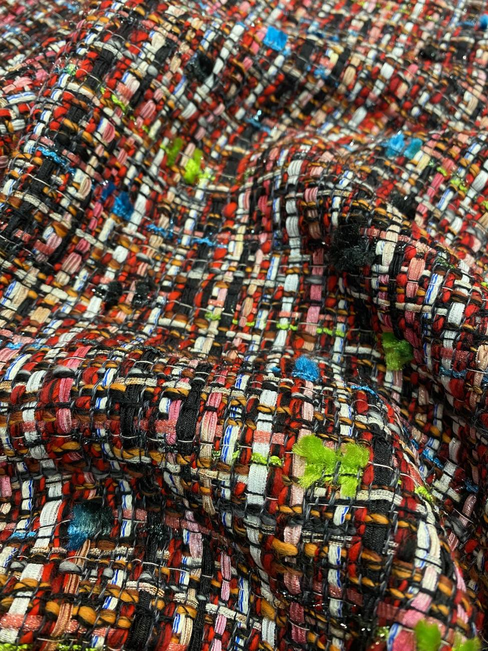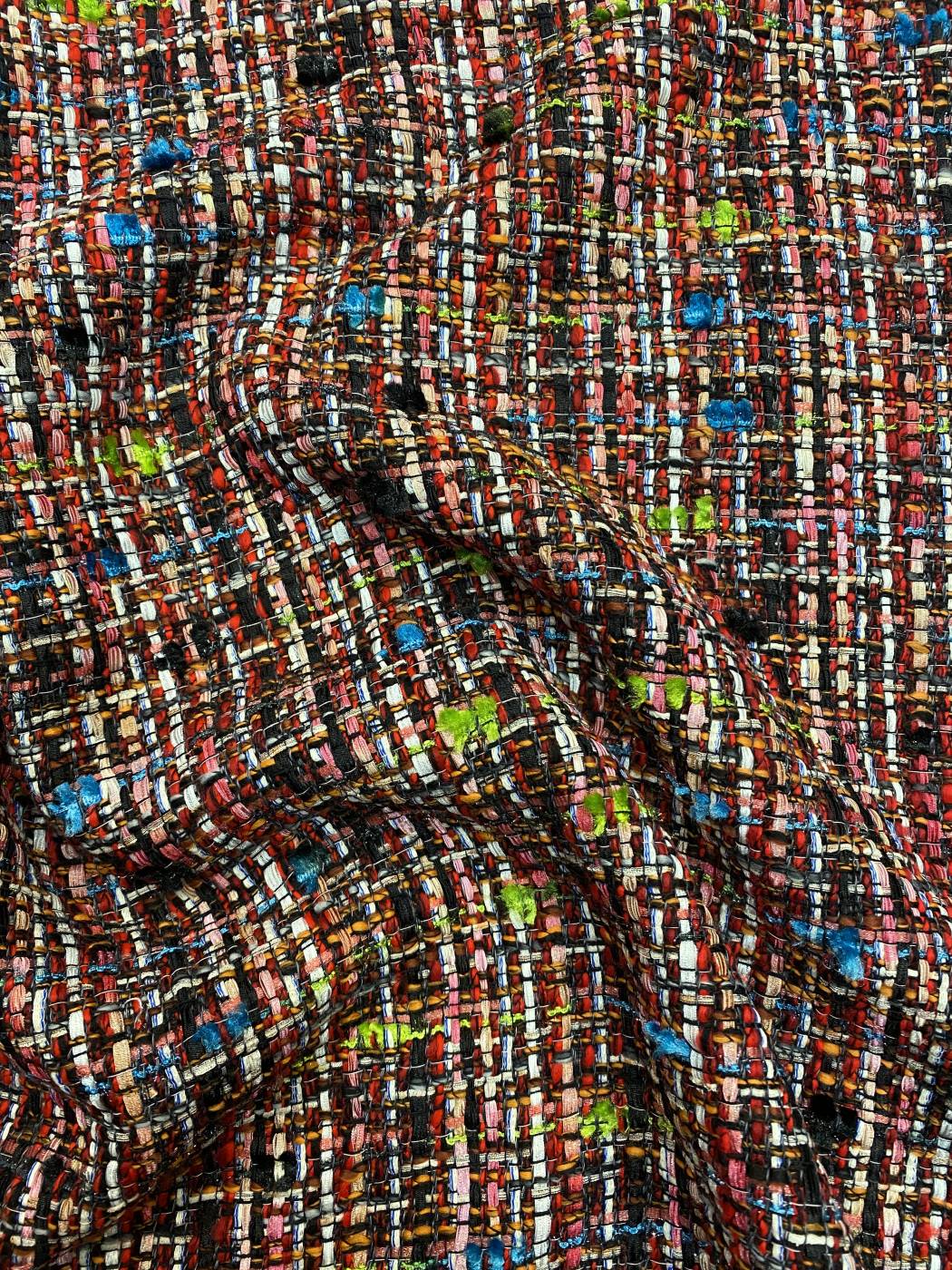 Ez a gazdag karakterű Chanel-stílusú bouclé szövet mély bordós és púderes rózsaszín tónusait élénk multicolor fonalak és finoman csillanó lurex szálak egészítik ki. A noppos beszövések tapintható mélységet adnak az anyagnak, miközben a sűrű, aprólékos szövés elegáns tartást biztosít. Igazi couture hangulatú textil, amely egyszerre nőies, energikus és látványosan egyedi.