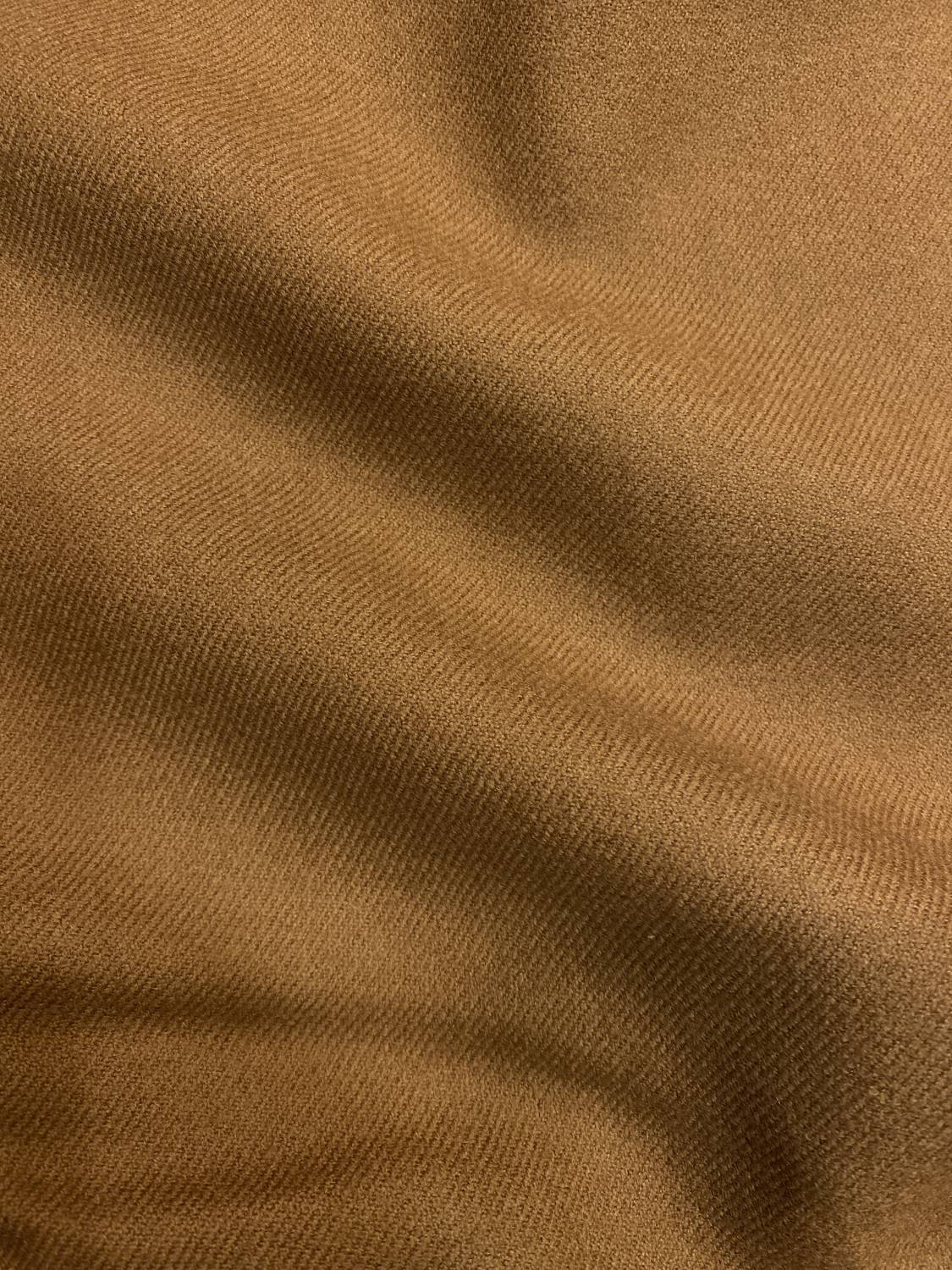 Camel színű, középvastag gyapjú szövet, finoman diagonális (enyhén halszálkás–sávolyos) szövéssel. A felülete tömör, mégis rugalmas esésű, nem durva tapintású, szépen tartja a formát, de nem merev. A szálstruktúra homogén, igényes, kifejezetten klasszikus, időtálló megjelenést ad.