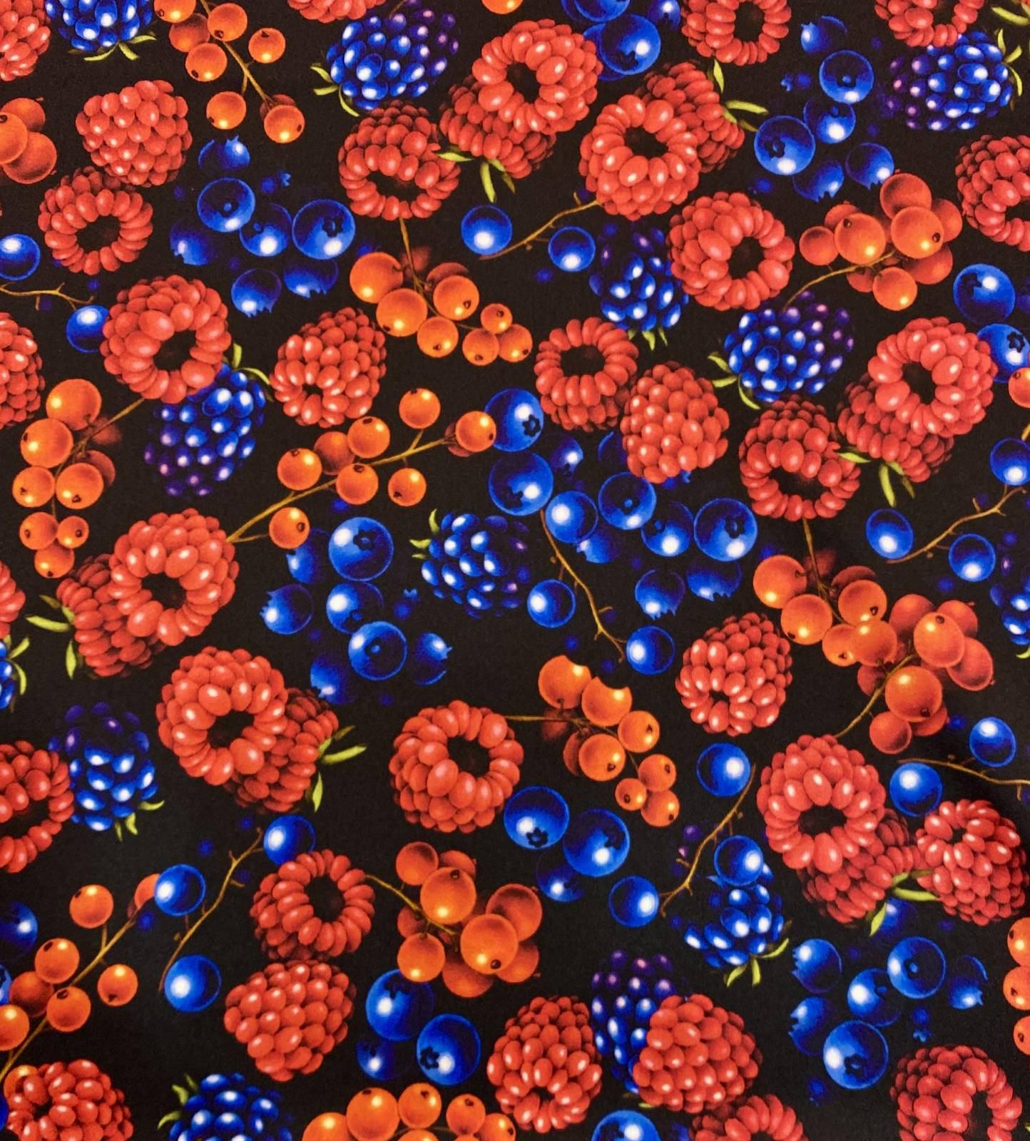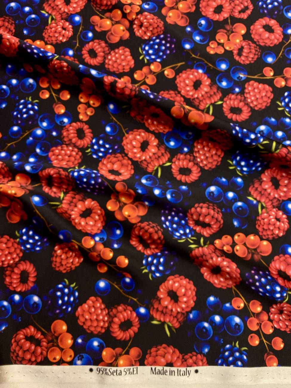 Magas minőségű elasztikus hernyóselyem szatén. Fekete alapon élénk, telített bogyós gyümölcs mintázatú, amely D&G, az olasz luxusdivat látványos, érzéki világát idézi. A selyem természetes fénye elegánsan emeli ki a mélypiros, narancsos és királykék árnyalatokat, miközben az elasztikus összetétel kényelmes viseletet és szép esést biztosít.
