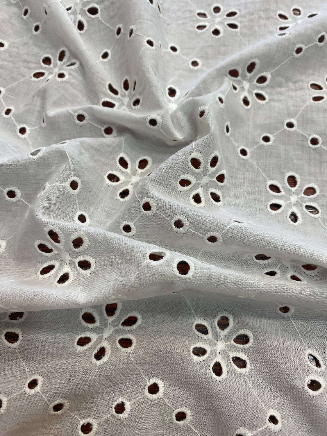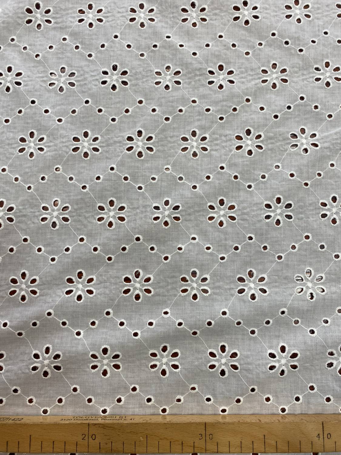 Ez a vékony pamut madeira szabályos, geometrikus elrendezésű virágmotívumokkal készült lyukhímzéses textil. A virágformák és az őket összekötő mintázat dekoratív, mégis letisztult megjelenést ad az anyagnak. A könnyű pamut alap miatt az anyag légies, jól szellőző és kifejezetten kellemes nyári viseletekhez.