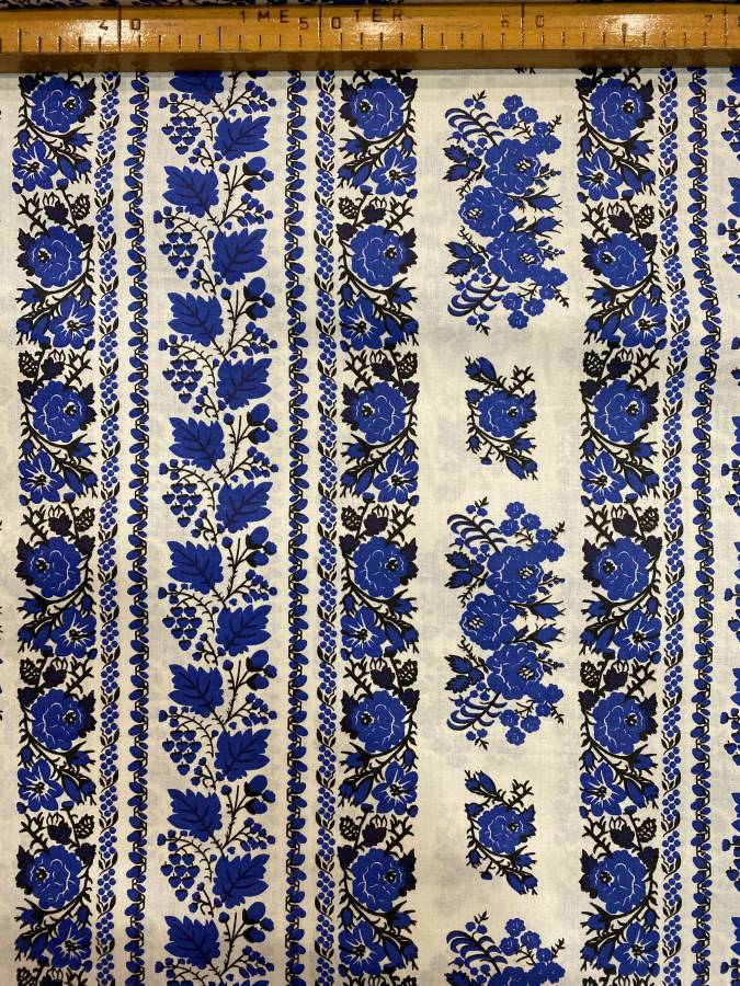 Fehér alapú pamut karton, kék és fekete virágos-csíkos mintával. A népi ihletésű, mégis modern hatású minta karakteres és dekoratív, különleges megjelenést ad a belőle készült ruháknak. Kiválóan alkalmas szoknyákhoz, blúzokhoz, népviseleti stílusú ruhákhoz vagy kreatív lakástextil célra. Természetes, könnyen kezelhető és jól szellőző anyag.