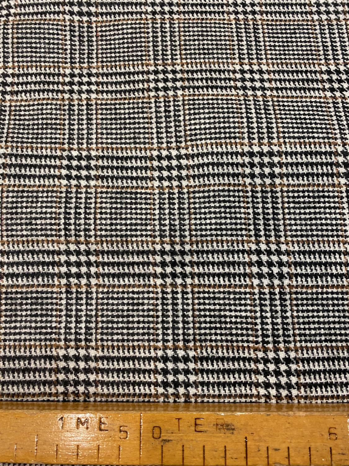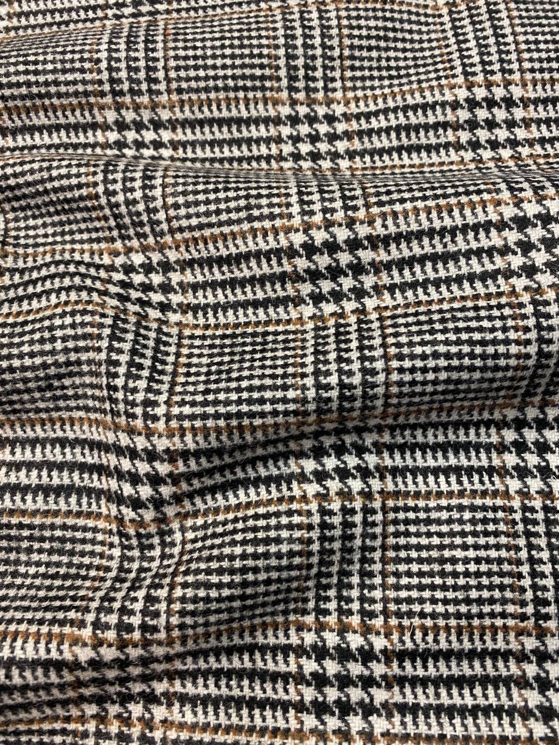 Ez a prémium minőségű, közepes vastagságú gyapjúszövet a klasszikus fekete-fehér Eszterházy-kockás mintát meleg barna csíkozással egészíti ki, ami elegáns és időtálló karaktert kölcsönöz az anyagnak. A szövet felülete finoman strukturált, tartása kiváló, ugyanakkor természetes gyapjúesése miatt szépen követi a szabásvonalakat. Ideális választás klasszikus, mégis modern megjelenésű ruhadarabok készítéséhez.
