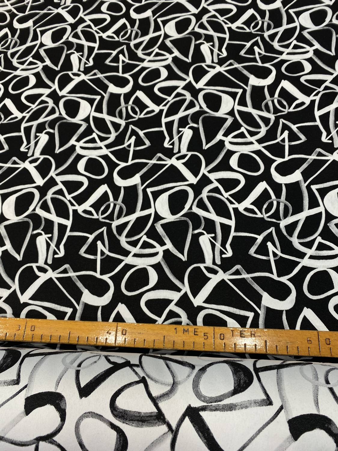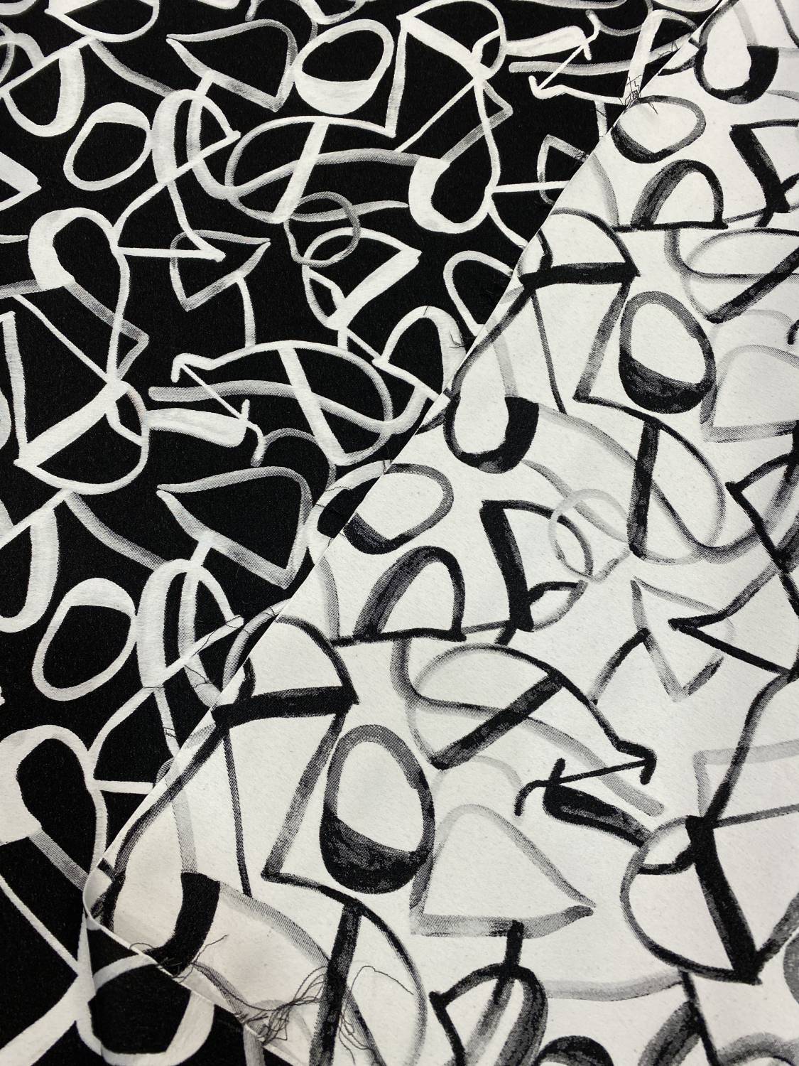 Ez a különleges olasz jacquard brokát karakteres fekete–fehér színvilágú, modern, grafikus hatású mintázattal készült. A stilizált, vonalas formákból álló absztrakt minta dinamikus és művészi megjelenést ad a szövetnek, miközben a brokátra jellemző gazdag szövés szép tartást és elegáns textúrát biztosít.