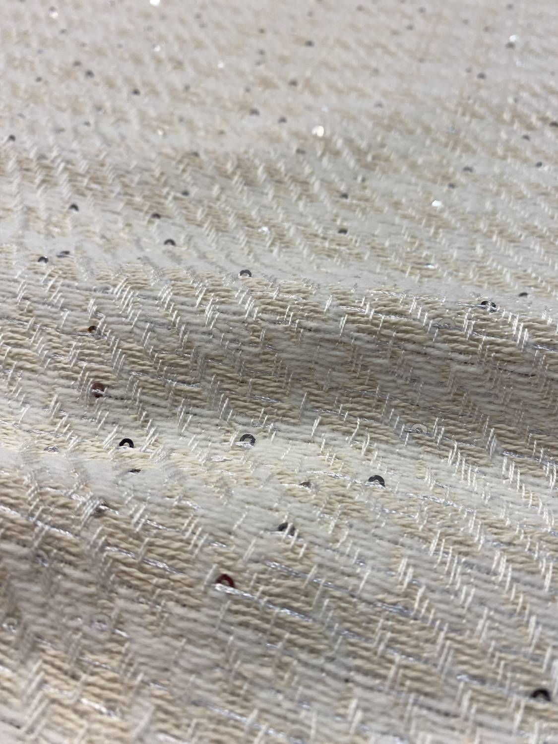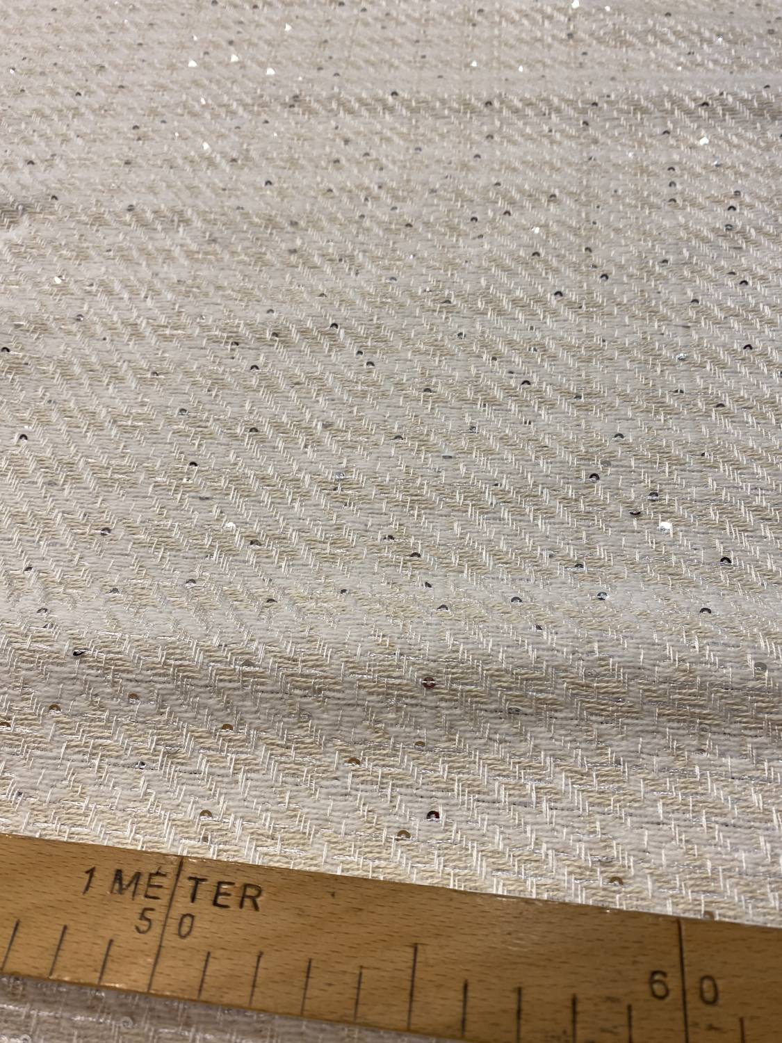 Prémium minőségű, középvastag Chanel típusú buklé szövet törtfehér–pezsgő árnyalatban, finoman átszőtt fényes szállal és szórtan elhelyezett paiettákkal. Geometrikusan sruktúrált felülete elegáns, couture hatást kelt, miközben stabil tartást biztosít.