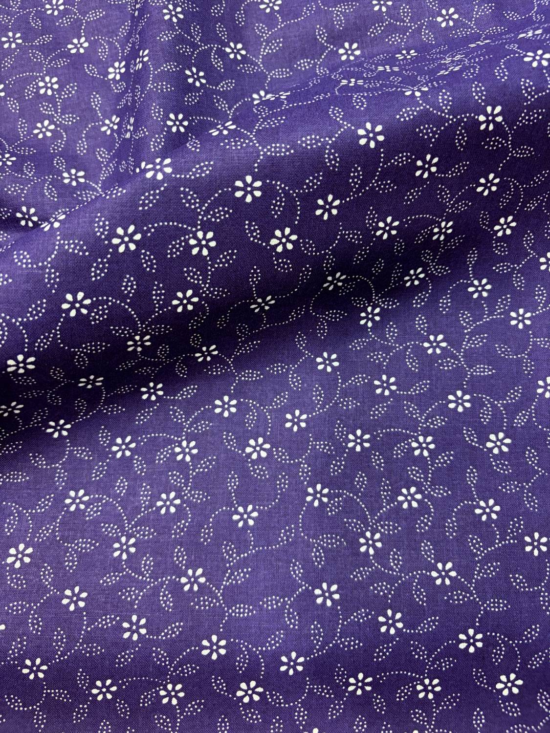 Elegáns ibolyakék pamut karton finom, indás apró virágmintával, amely a hagyományos kékfestő motívumok modern változatát képviseli. Könnyen varrható, jól formázható textil, amely dekoratív megjelenésével népi és romantikus stílushoz egyaránt illik. Aprólékos mintája kifinomult, mégis barátságos karaktert ad a kész daraboknak.
