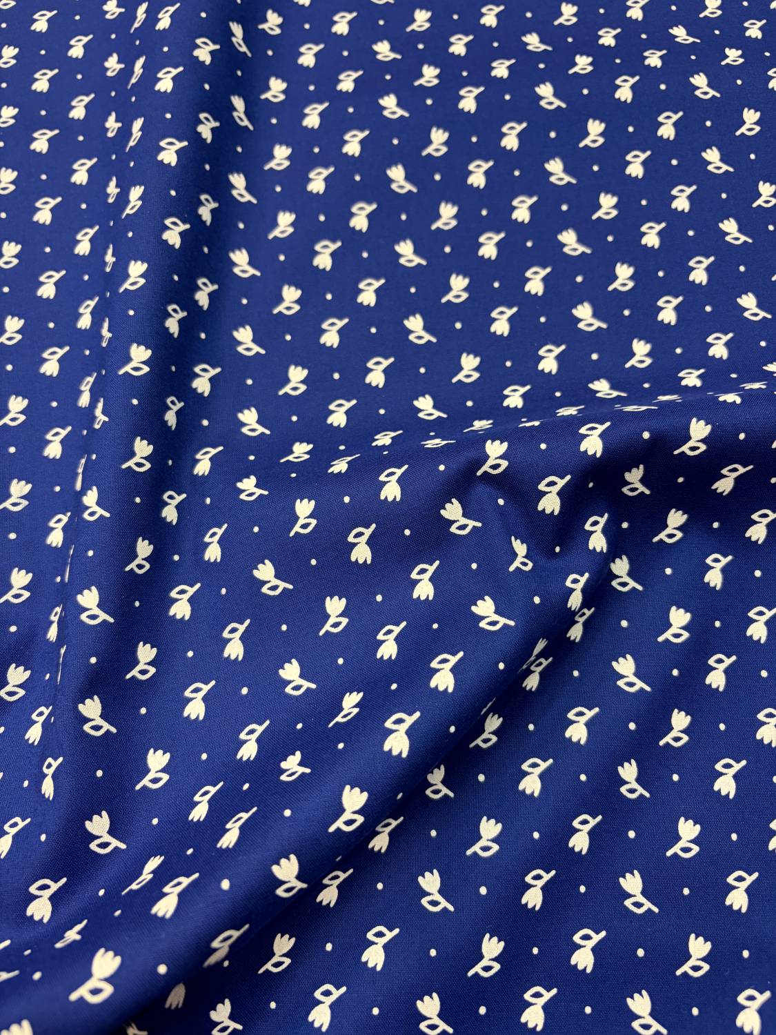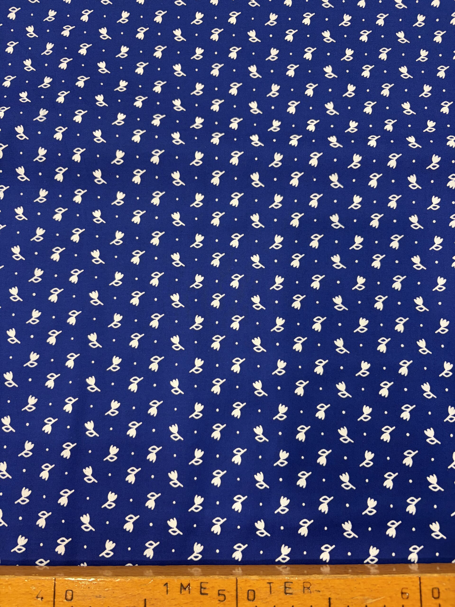 Indigókék alapon apró fehér tulipánmintás pamut karton, klasszikus magyar kékfestő hangulattal. Tartós, könnyen varrható, időtálló mintával.