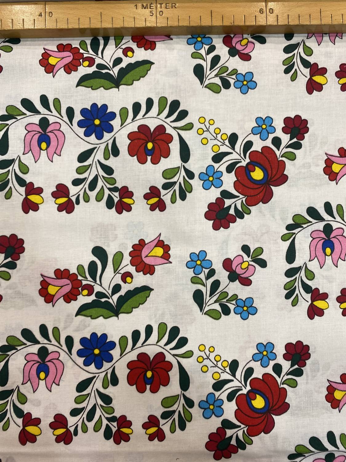 Fehér alapú pamut karton élénk, magyaros hangulatú színes virágmintával. A piros, kék, zöld és sárga árnyalatok vidám, hagyományőrző, mégis modern megjelenést adnak az anyagnak. Kiváló választás blúzokhoz, szoknyákhoz, nyári ruhákhoz vagy akár népi ihletésű dekorációkhoz is. Strapabíró, könnyen kezelhető, jól szellőző természetes anyag.