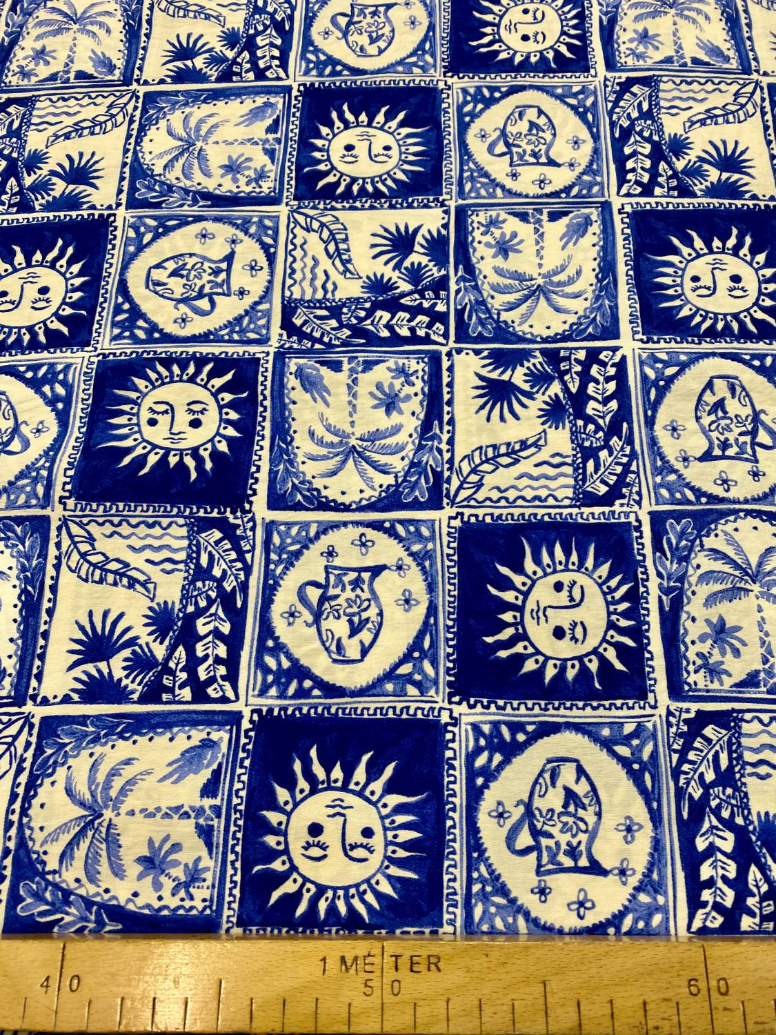 Klasszikus kék-fehér tónusú, csempemintát idéző grafikus kompozíció nap-, pálma- és stilizált tájmotívumokkal. A minta mediterrán hangulatot áraszt, kissé retro, mégis időtálló karakterrel. A viszkóz flokon puha tapintású, lágy esésű, kényelmes viselet, amely szépen mozog járás közben.