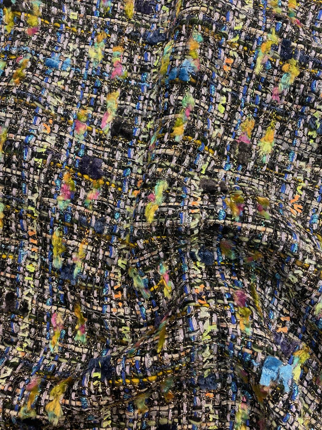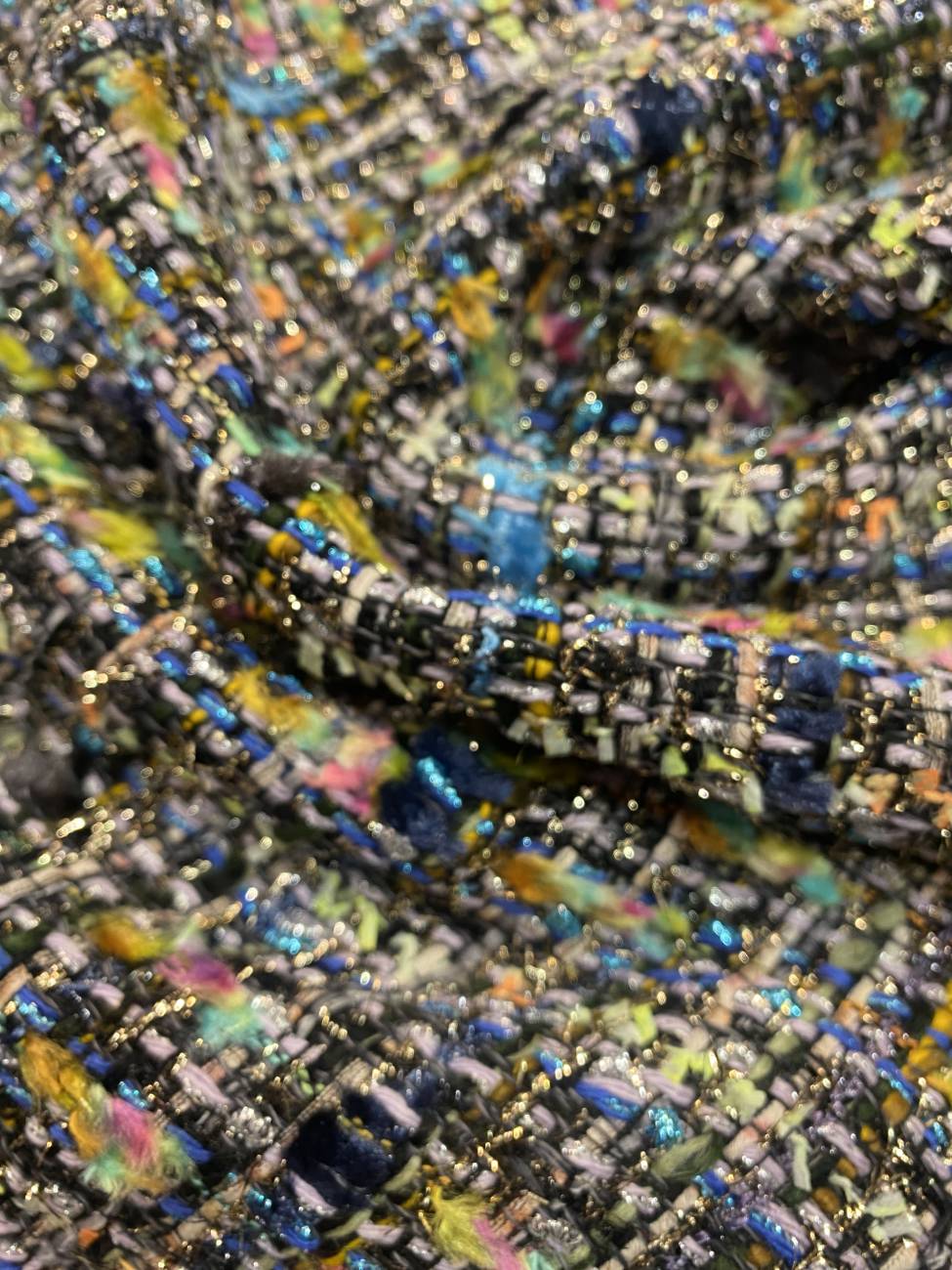 Kékes főszínű Chanel-stílusú bouclé szövet gazdag, többszínű fonalstruktúrával és csillogó lurex szálakkal átszőve különösen élő, mély felületet ad. A játékos noppos beszövés finom térbeliséget kölcsönöz az anyagnak, miközben a metálfényű részletek elegáns kontrasztot teremtenek. Közepes vastagságú, jó tartású, karakteres textil, amely önmagában is látványos.