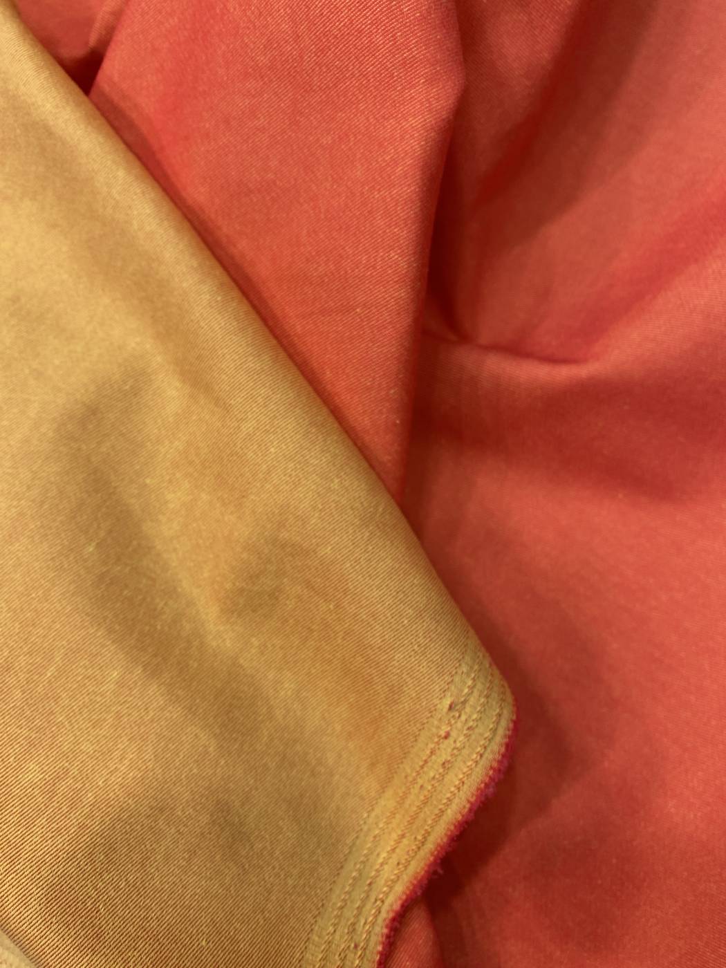 Ez a középvastag, dublé kivitelű elasztikus pamutvászon két karakteres, meleg színt ad: egy korallos-vöröses oldalt és egy sárgás aranyhomok árnyalatot. A réteges szerkezet miatt a tónusok finoman átjátszanak egymásba, így az anyag hajlatban és mozgás közben különösen élő, intenzív színhatást mutat. Stabil tartású, mégis kényelmesen rugalmas.