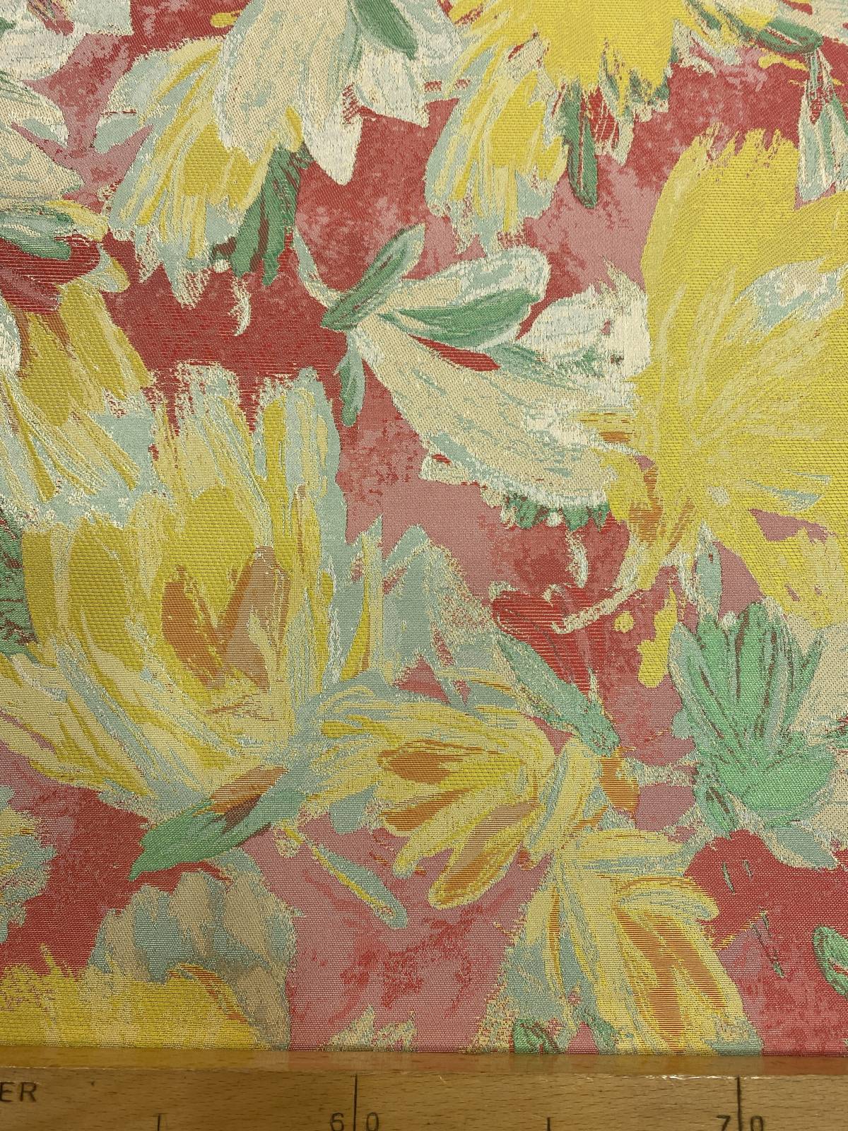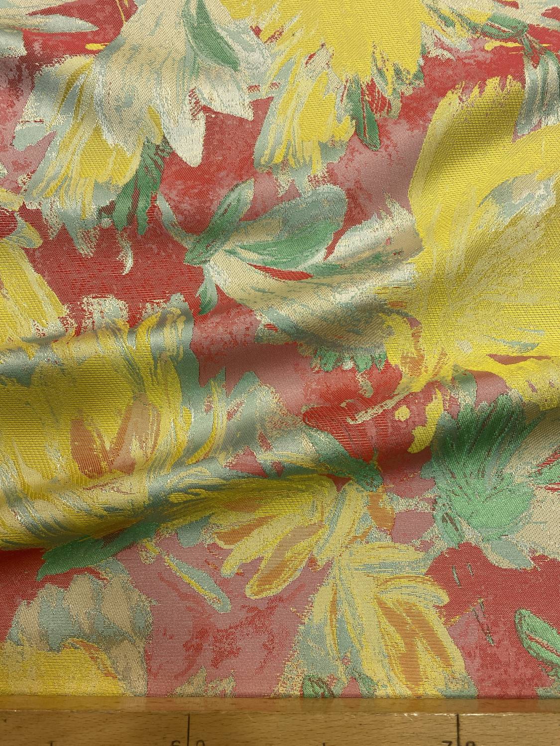 Magas minőségű, jacquard szövésű jellegű olasz jacquard brokát festői, lendületes virágmintával. A korall, citromsárga és menta árnyalatok friss, tavaszias karaktert adnak, a szövött struktúra pedig elegáns tartást biztosít. Különleges, designer hatású textil.