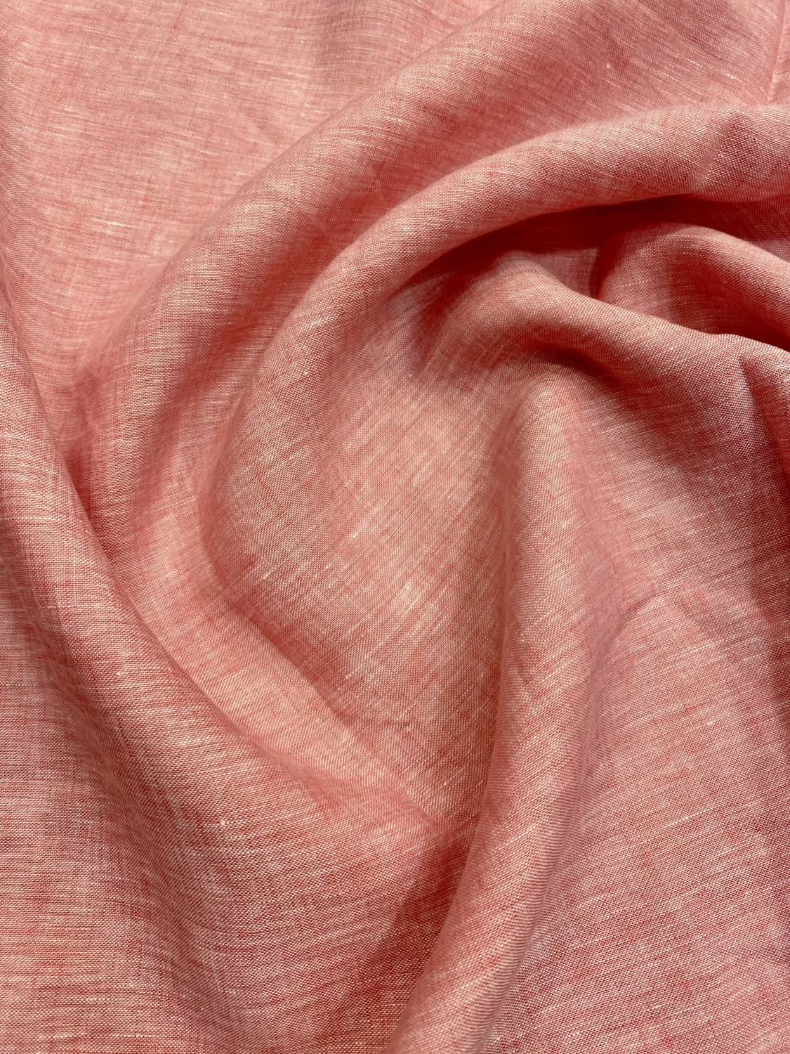 100% lenből készült, vékonyabb súlyú szövet. Friss, természetes tapintású, enyhén merev tartásával szépen kiemeli a szabásvonalakat. Színe lágy korallrózsaszín, finoman melírozott lenes szálrajzzal, amely élő, kézműves hatású felületet ad az anyagnak. Mintázata egyszínű, karakterét az apró, természetes len-csomócskák és a vászonkötésből fakadó finom struktúra határozza meg.