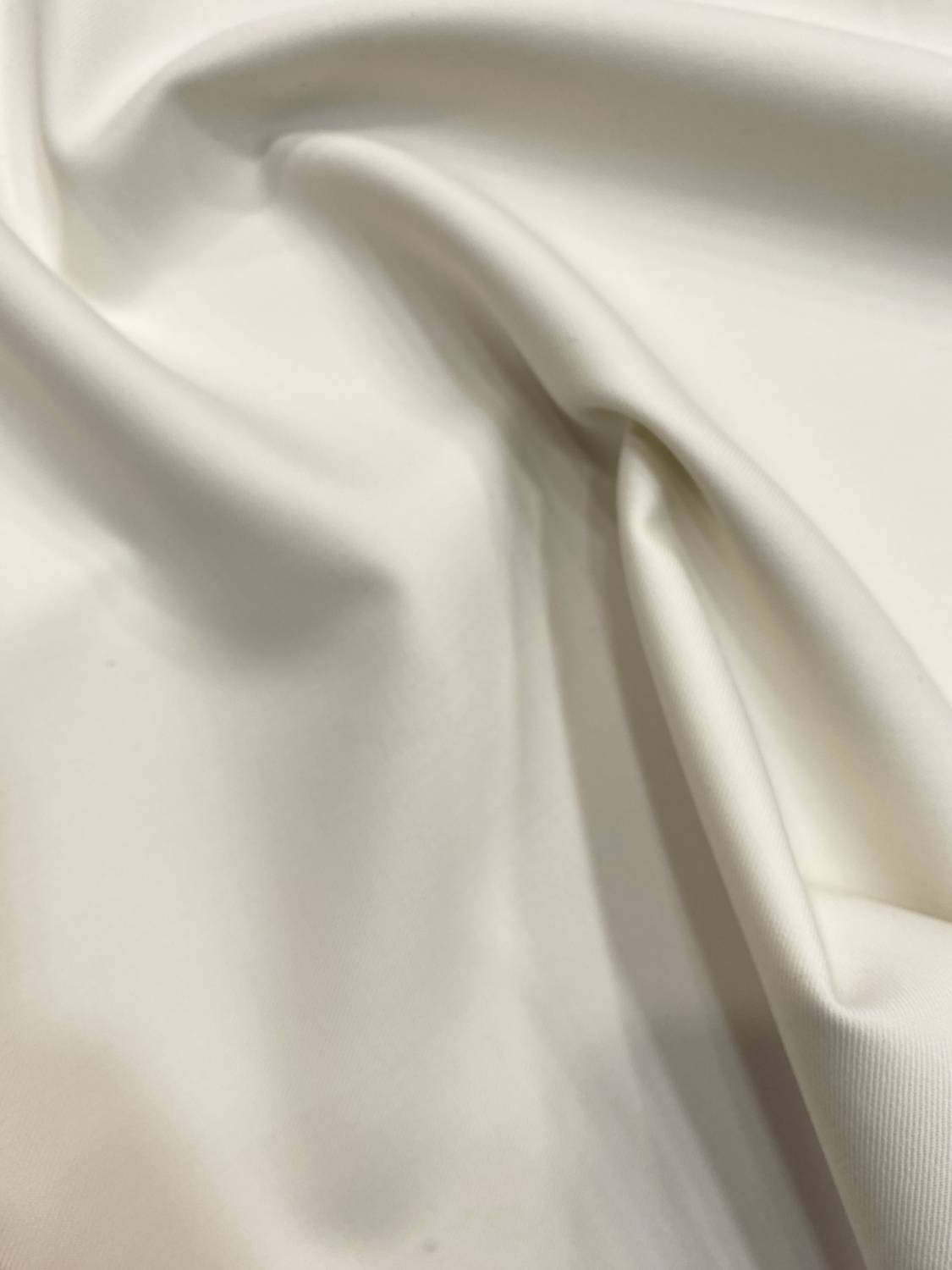 100% gyapjúból készült, vékony szövet. Letisztult, törtfehér árnyalatával kifinomult, időtálló megjelenést ad. Felülete egyszínű, finoman simított, enyhén selymes tapintású, a szövés diagonális rajzolata csak közelről érzékelhető, ami elegáns, homogén képet eredményez.
