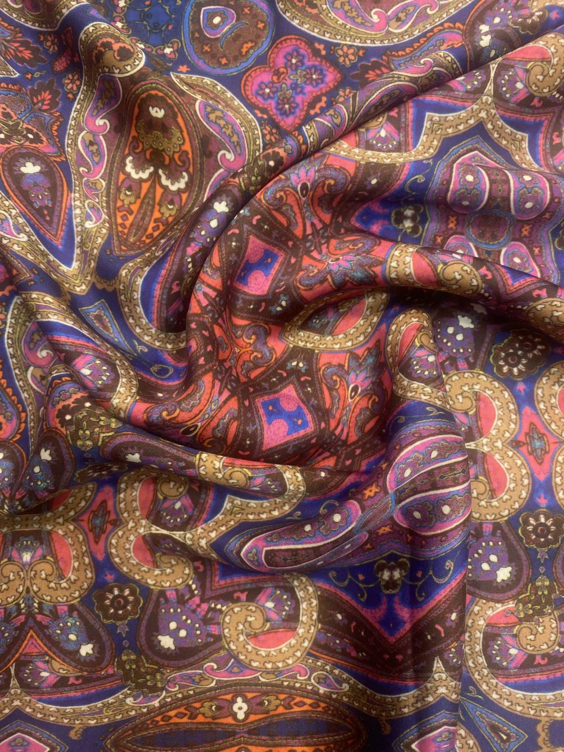 Látványos, karakteres olasz viszkóz flokon gazdag orientális paisley és ornamentális mintavilággal. A lila, bordó, rózsaszín és aranybarna tónusok mély, dekoratív összhatást adnak az anyagnak. Finom tapintású, könnyű és jól eső textil, amely szépen követi a test vonalát.