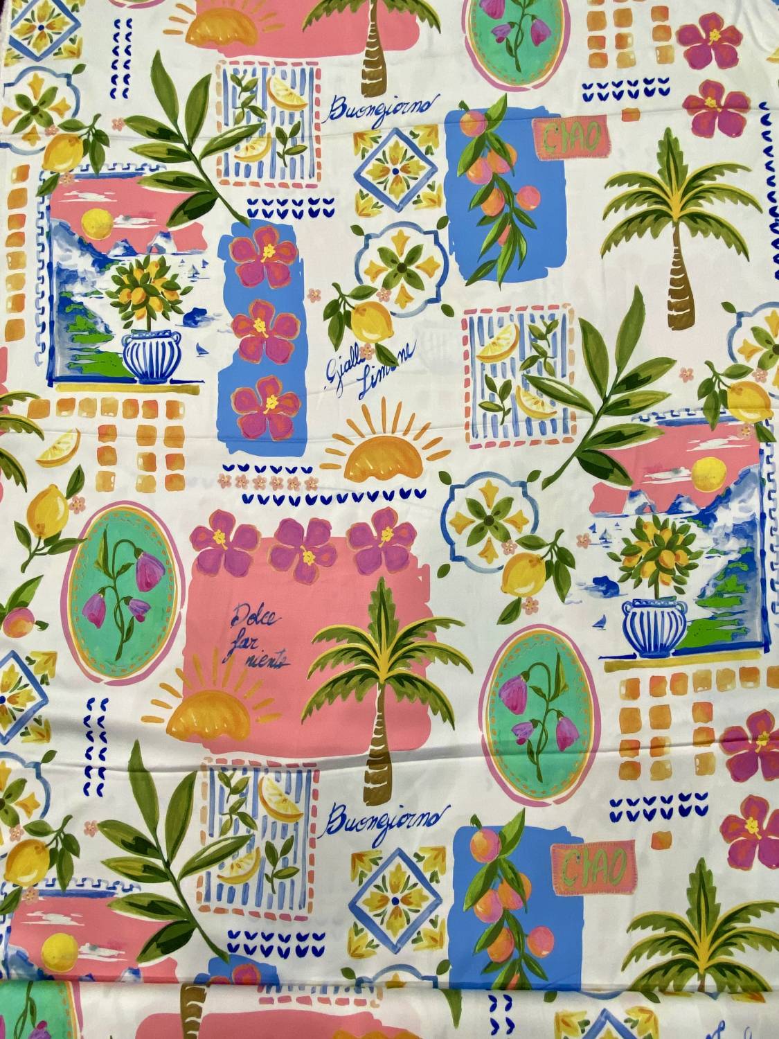 Könnyű, lágy esésű, prémium minőségű olasz viszkóz flokon, élénk mediterrán hangulatú mintával. A vidám kompozícióban citromok, virágok, pálmák és dekoratív csempemotívumok jelennek meg friss rózsaszín, kék, zöld és sárga árnyalatokkal. A finoman felületű flokon kellemesen szellős viseletet ad, ezért ideális a nyári ruhatár könnyed darabjaihoz.