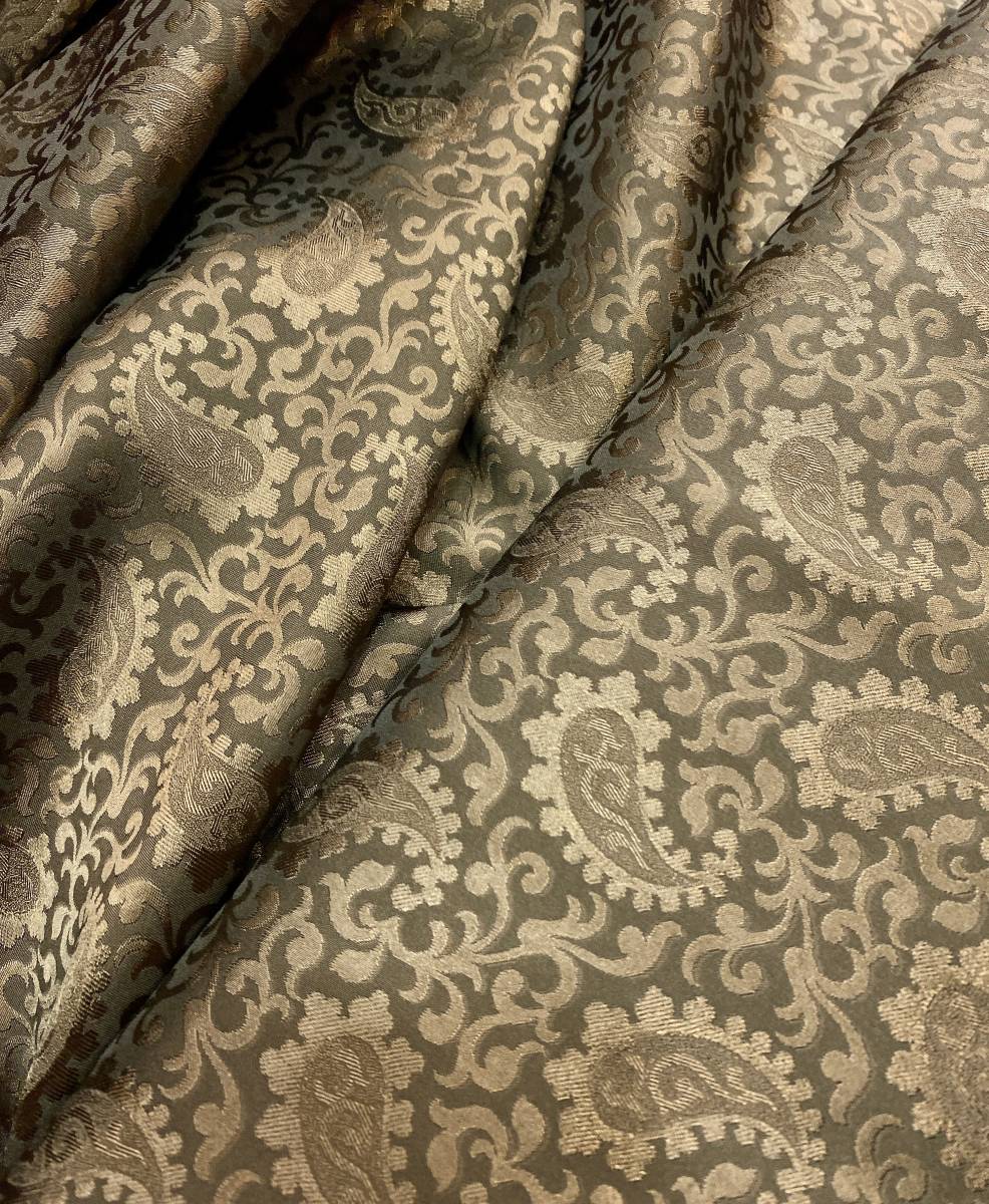 Prémium minőségű, óarany tónusú, elasztikus viszkóz bélés, finom jacquard szövésű paisley (kasmír) mintával.