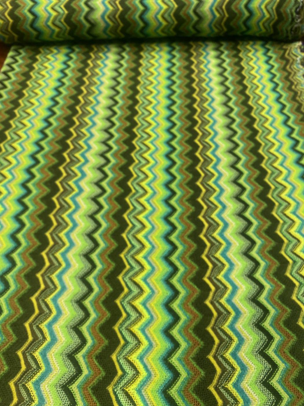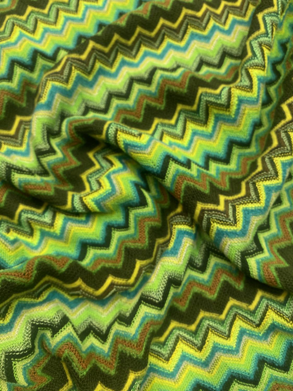 Ez az ikonikus Missoni hurkolt anyag karakteres cikcakk mintázattal és vibráló zöld–lime–türkiz–olíva színátmenetekkel készült, erőteljes vizuális hatást adva minden modellnek. Puha tapintású, rugalmas szerkezetű, jól idomul a test vonalaihoz, miközben a grafikus mintaritmus látványosan érvényesül mozgás közben is.