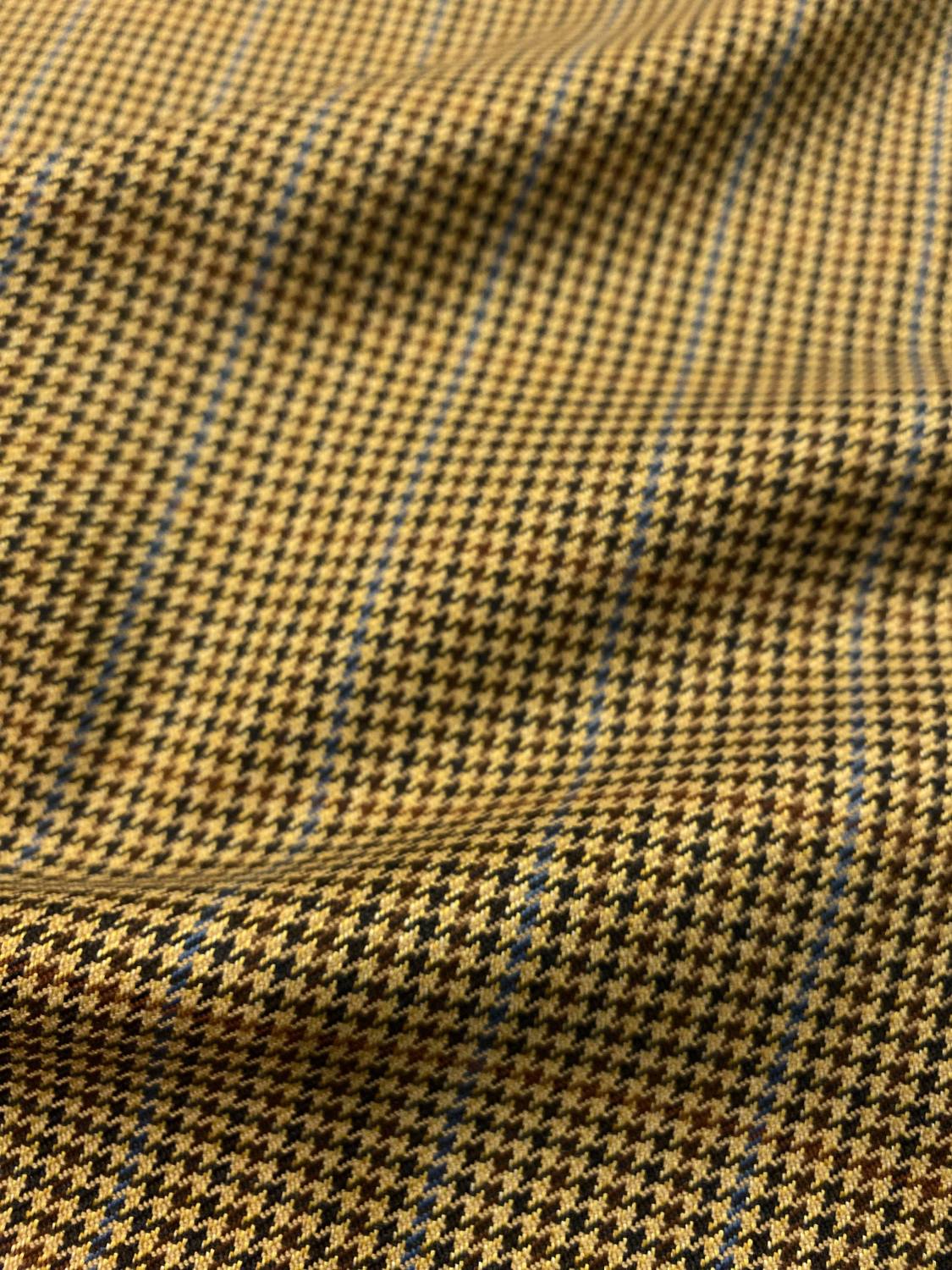 Ez a magas minőségű, vékonyabb gyapjúszövet elegáns mustársárga árnyalatával és klasszikus Eszterházy-kockás mintájával időtálló, kifinomult megjelenést ad. Az apró pepita struktúrát finom kék csíkok tagolják, amelyek karakteres, mégis harmonikus összhatást hoznak létre. A szövet kellemes tartású, jól szabható és szépen formálható, így ideális választás elegáns, strukturált ruhadarabok készítéséhez.