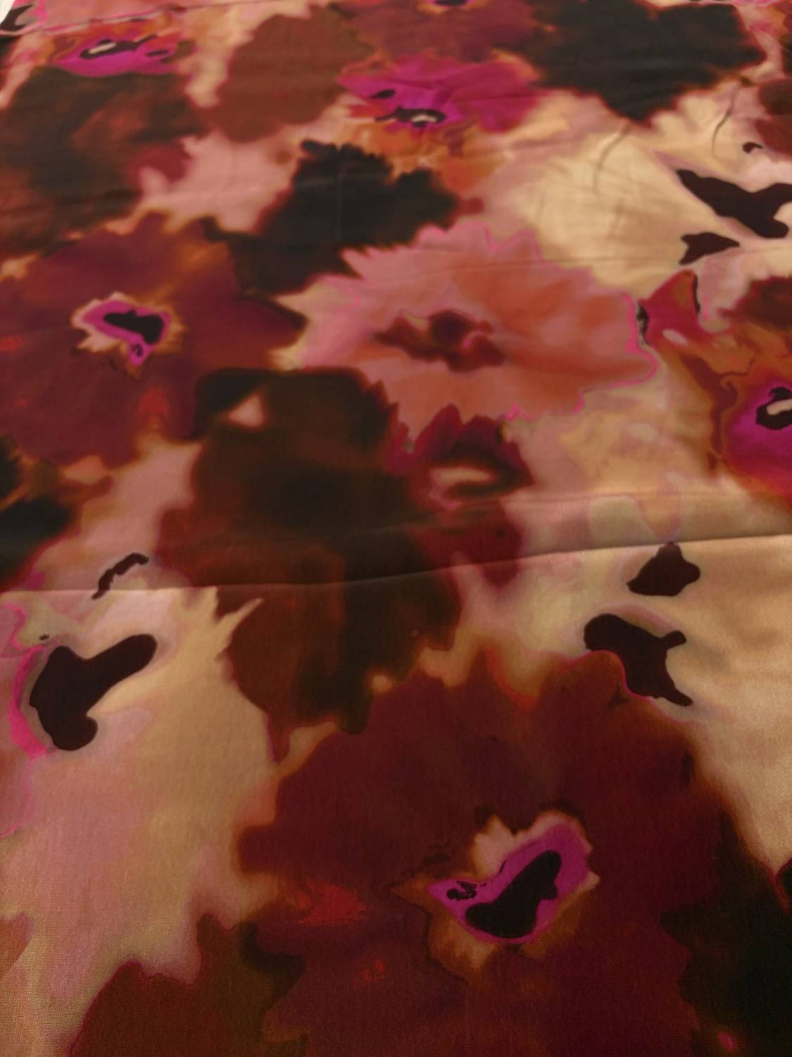 Modern, festői hatású mintával készült könnyű olasz viszkóz, amelyben a bordó, rozsda és púder árnyalatok harmonikusan olvadnak össze. Lágy esése és finom tapintása elegáns, mégis karakteres megjelenést ad. Különleges mintája miatt statement darabokhoz is kiváló.