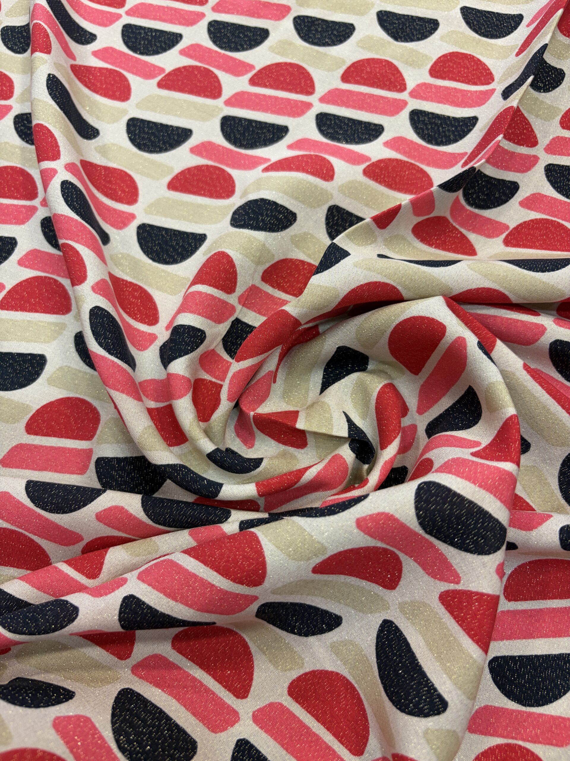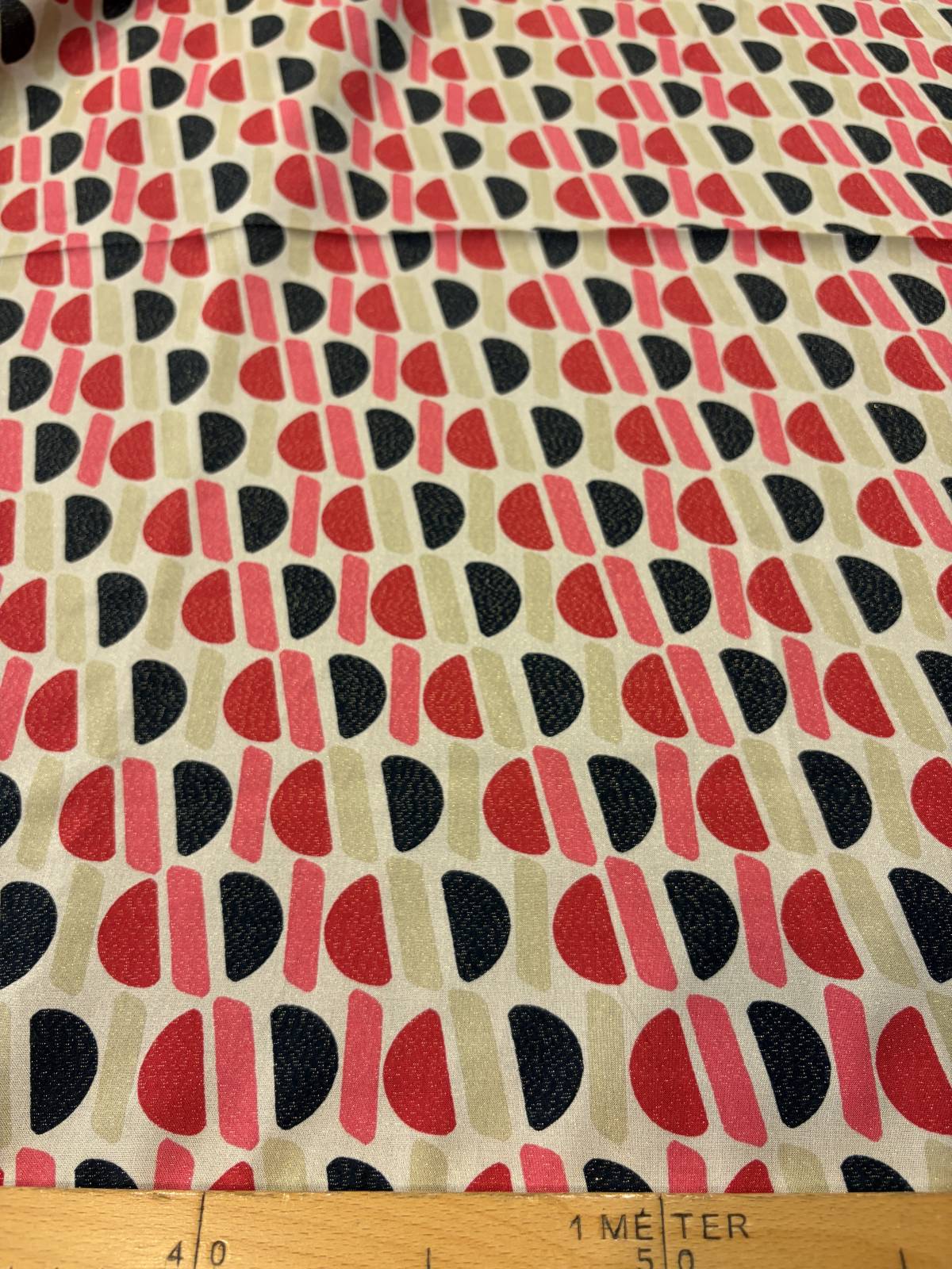 Különleges geometrikus mintával készült könnyű olasz viszkóz, amelyet finom arany hatás tesz még elegánsabbá. A modern grafikai minta és a kellemesen lágy esés kombinációja exkluzív megjelenést biztosít. Légies, kényelmes anyag nyári viseletekhez.