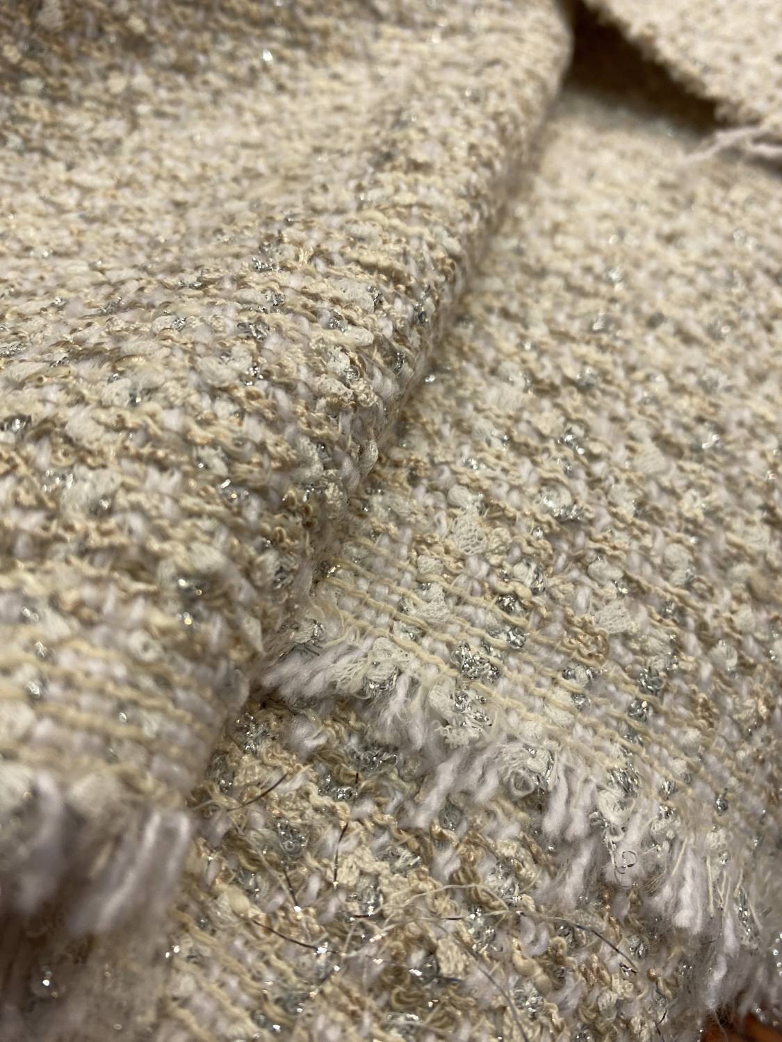 Középvastag, strukturált felületű Chanel buklé szövet, amely finom pezsgő, vajszín és lágy arany árnyalatokban játszik. A gazdag, hurkolt textúrát diszkréten elszórt apró pailletták és fényes aranyló szálak teszik különlegessé, amelyek elegánsan, nem hivalkodó módon csillannak meg a fényben. A felület plasztikus, dús hatású, mégis kifinomultan nőies és ünnepélyes karakterű.