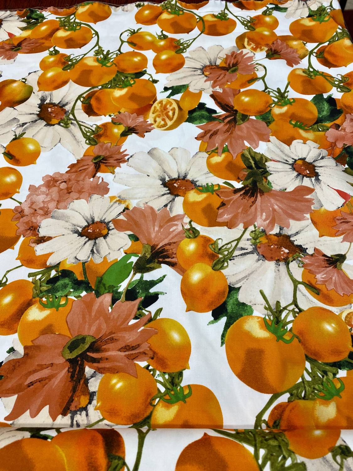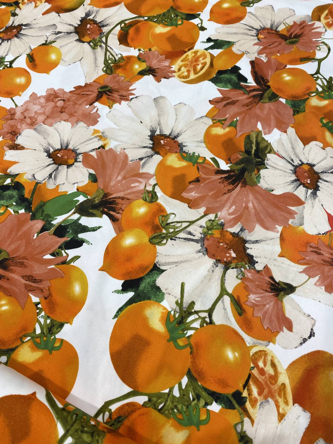 Középvastag, jó tartású, elasztikus pamutvászon fehér alapon különleges, dekoratív mintával. A lendületes kompozícióban élénk narancssárga paradicsomok és romantikus virágmotívumok jelennek meg, amelyek friss, mediterrán hangulatot kölcsönöznek az anyagnak. A szövet kellemes tapintású, enyhén rugalmas, ezért kényelmes viseletet biztosít, miközben szépen tartja a formát.