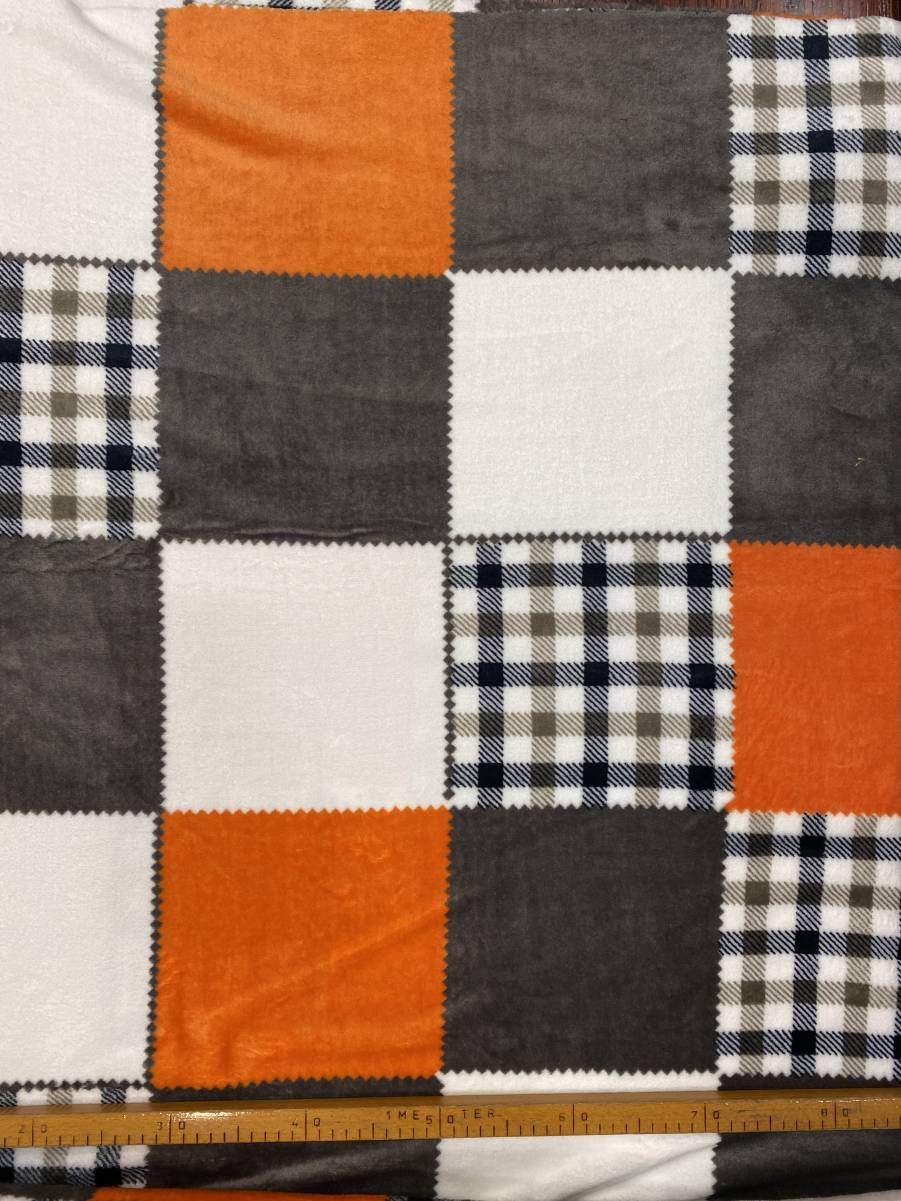 Ez a foltvarrás hatású wellsoft anyag modern és játékos megjelenésű, meleg, bolyhos tapintású textil. A narancs, szürke, fehér és kockás mintás négyzetek váltakozása friss, otthonos hangulatot ad, miközben a wellsoftra jellemző selymes puhaság és meleg tapintás megmarad.