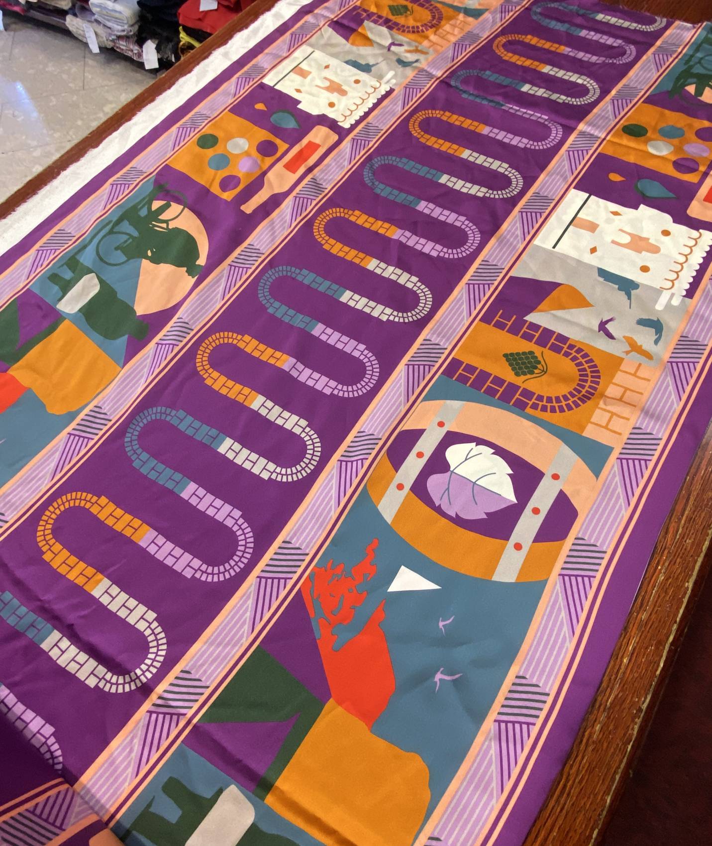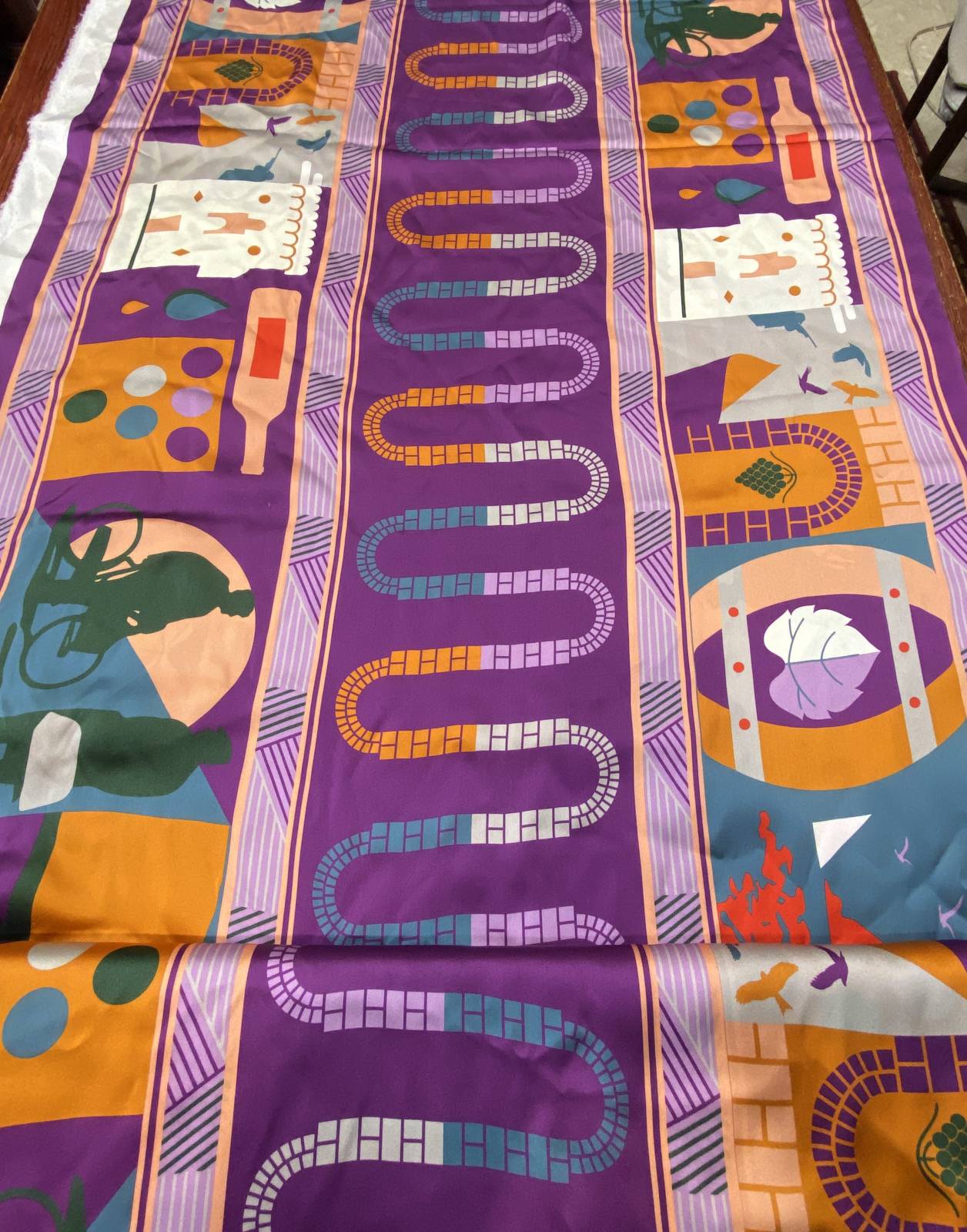 Különleges megjelenésű, prémium minőségű hernyóselyem szatén, élénk lila, narancs és türkiz árnyalatokból álló modern grafikus mintázattal. A selyem felülete finoman fénylő, sima tapintású és gyönyörű esésű, ami elegáns és látványos ruhadarabok készítésére teszi ideálissá. A dekoratív sávos kompozíció és a stilizált motívumok igazi designer hangulatot adnak az anyagnak, ezért különleges alkalmi ruhákhoz és egyedi divatdarabokhoz is tökéletes választás.