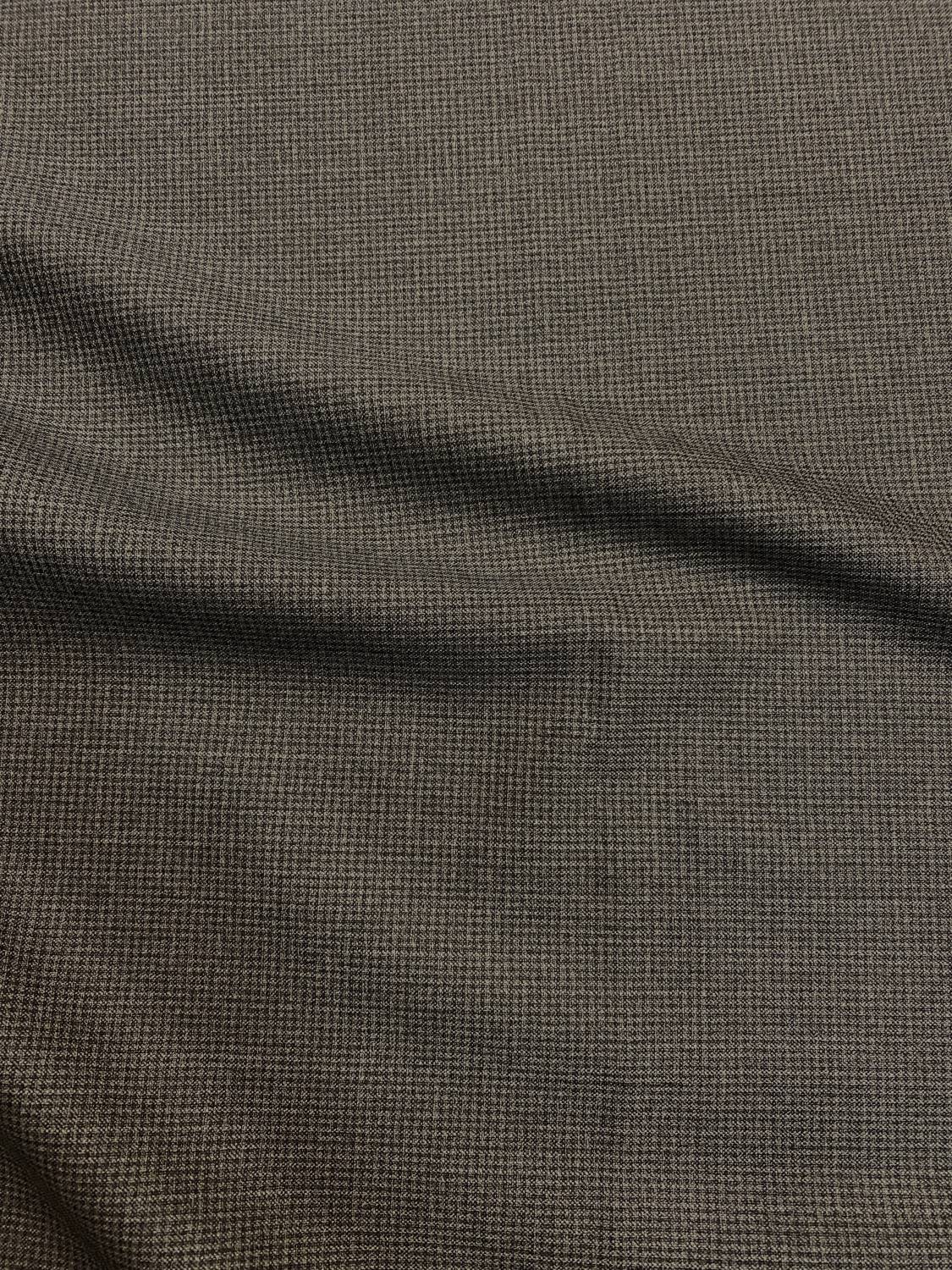 Szürkésbarna színvilágú, magas minőségű vékony gyapjú szövet. Diszkrét mikrostruktúrájával különleges mélységet ad a felületnek, miközben megőrzi letisztult eleganciáját. Könnyed esése, kellemes tapintása és természetes légáteresztő tulajdonságai révén ideális alapanyag precízen szabott, komfortos, egész évben hordható ruhadarabokhoz