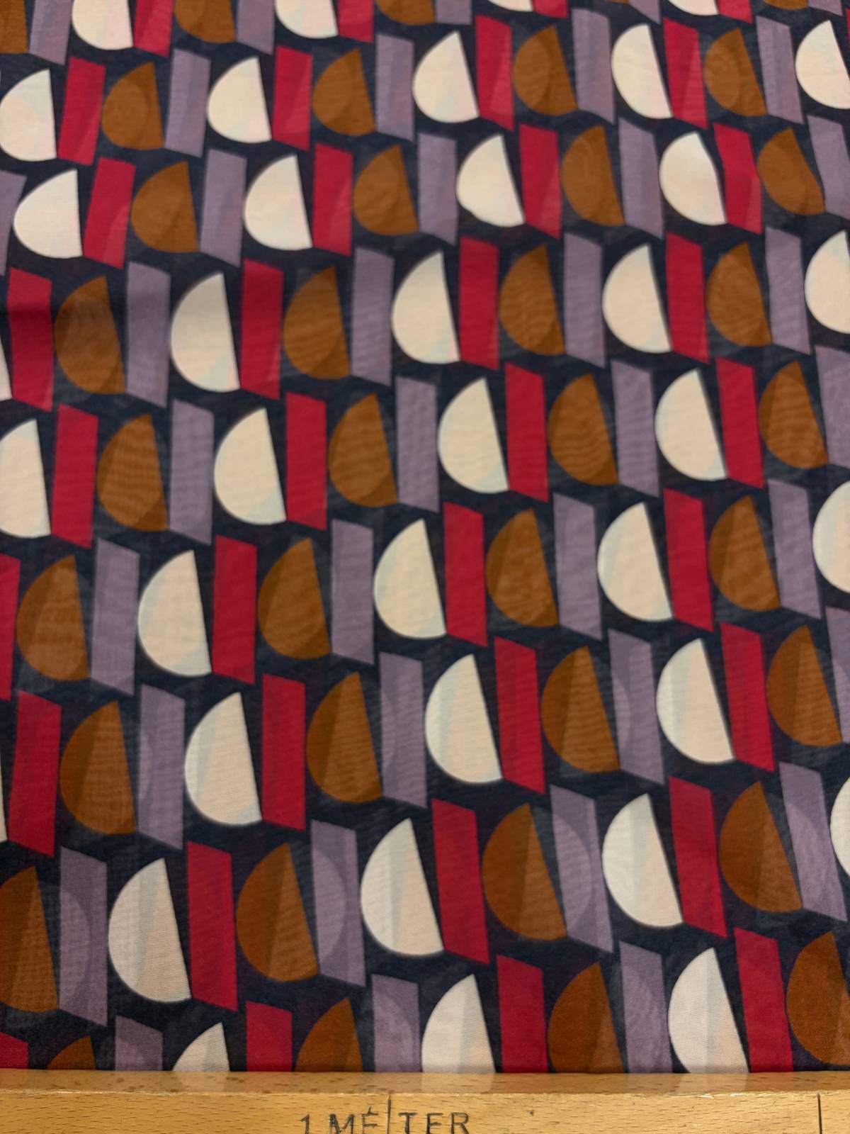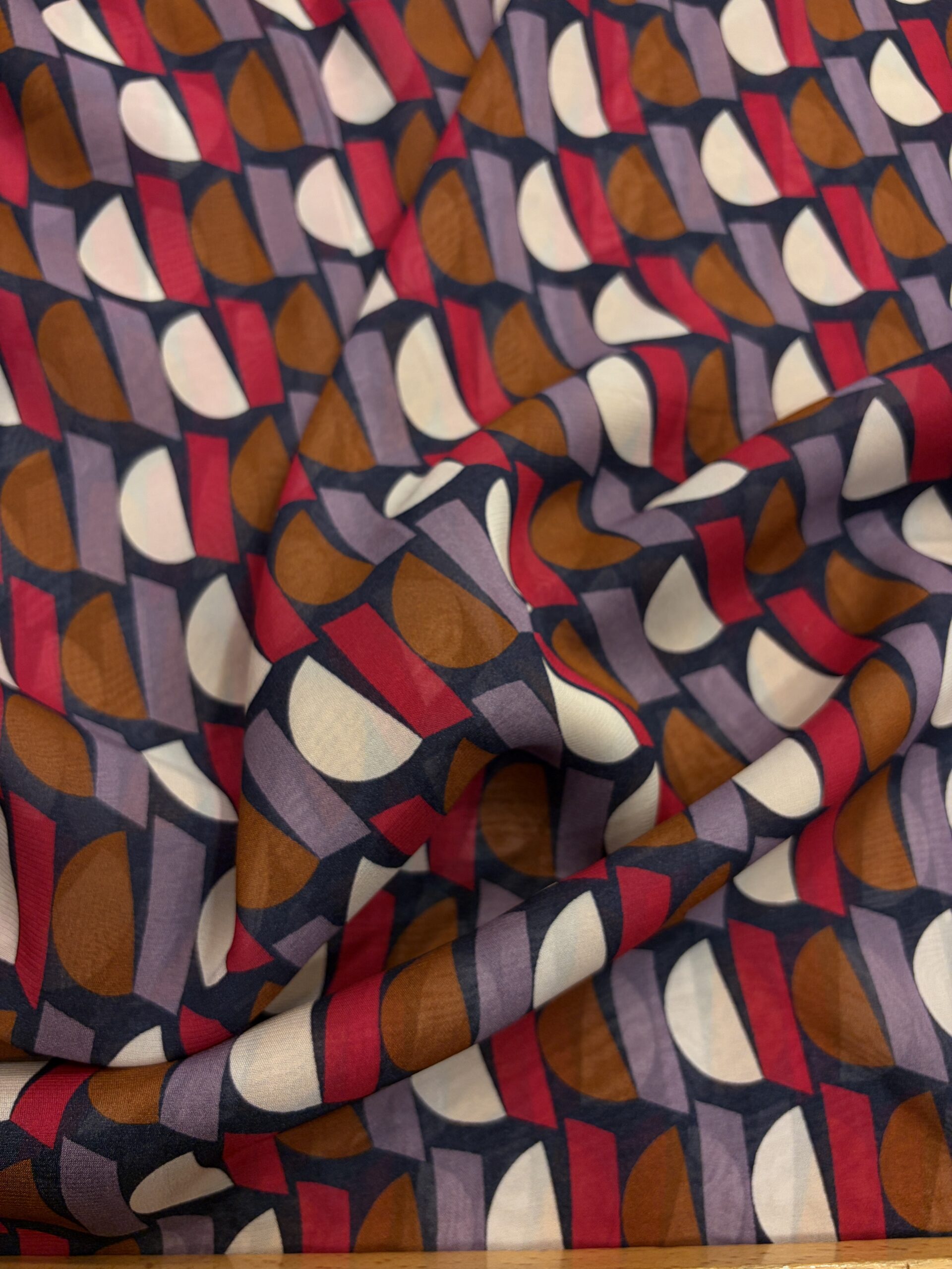 Prémium minőségű olasz viszkóz muszlin, különleges geometrikus mintával, mély sötét alapon bordó, fahéjbarna, törtfehér és szürkés-lila tónusokkal. Könnyű, finoman áttetsző, lágy esésű anyag, amely elegáns mozgást és kellemes viseletet biztosít. Modern, kissé retró hangulatú mintája karakteres, mégis harmonikus megjelenést ad.