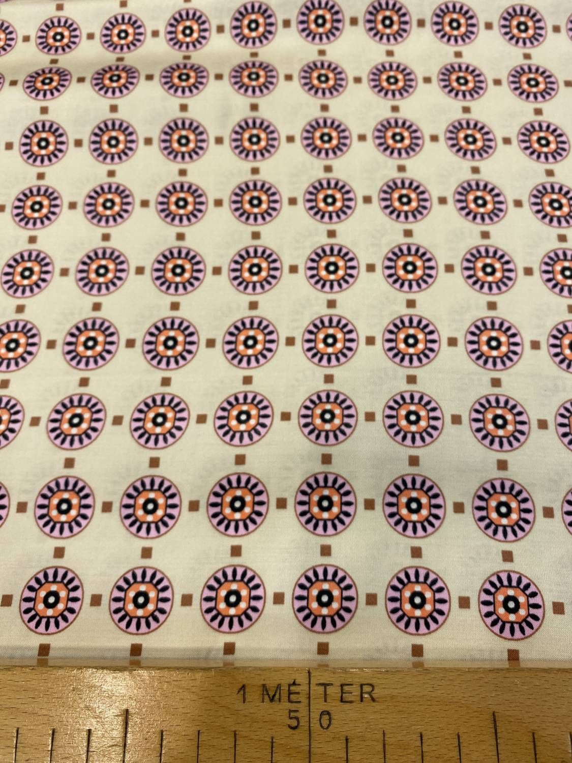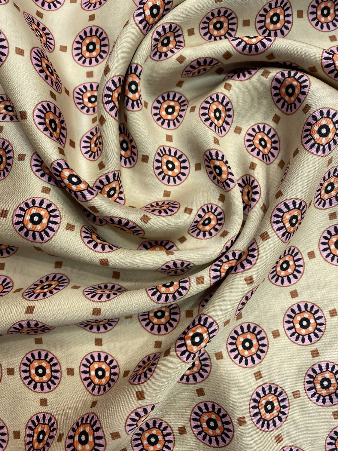 Stílusos, grafikus hatású olasz viszkóz flokon apró kör- és mozaikmotívumok ritmikus ismétlődésével. A krémes alapot rózsaszínes, narancsos és barna tónusú geometrikus elemek teszik izgalmassá, amelyek finom retró hangulatot idéznek. Könnyű, lágy esésű anyag, amely kényelmes és elegáns viseletet biztosít.