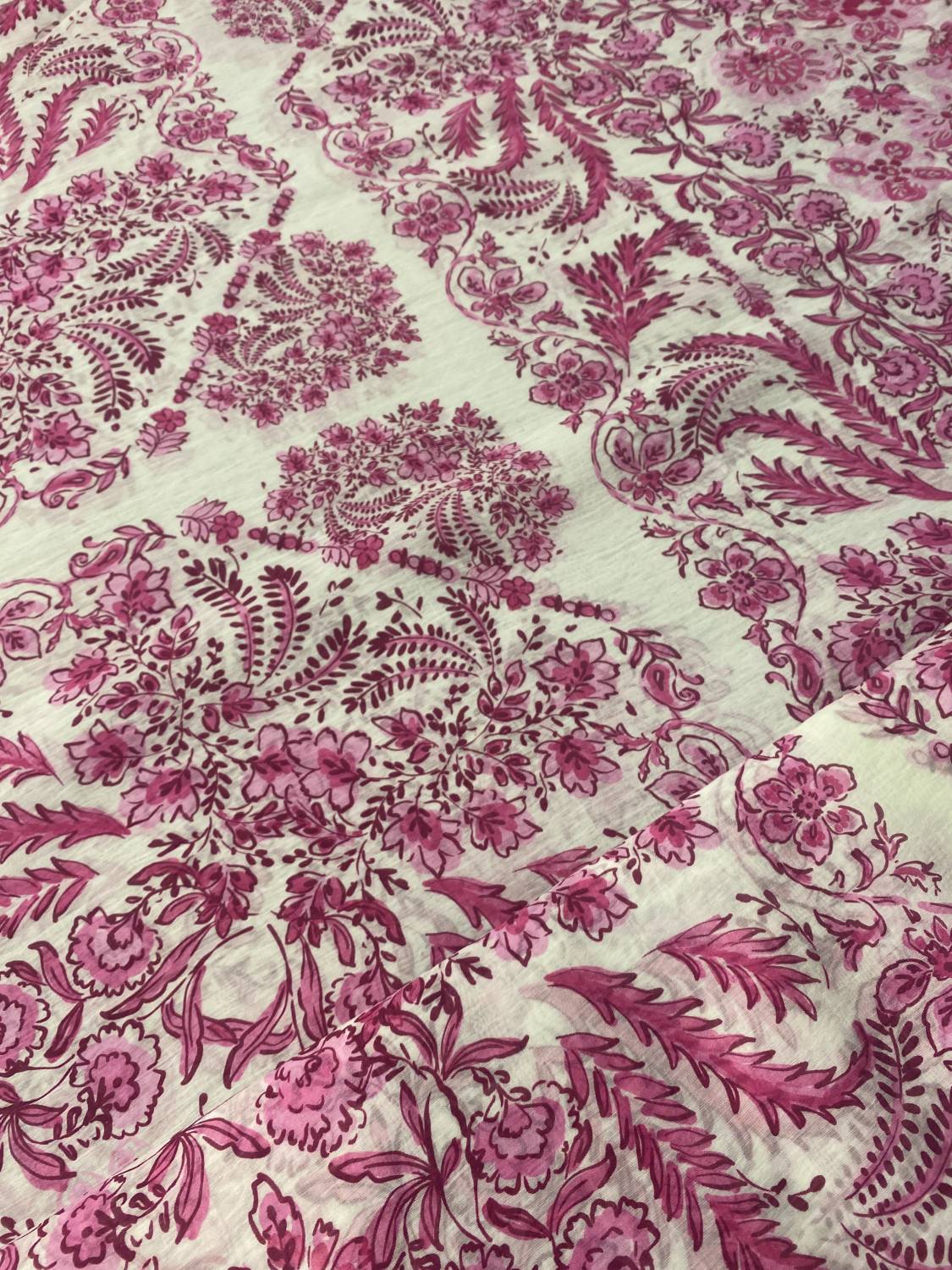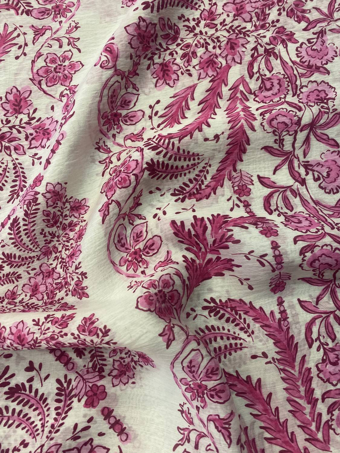 Könnyű, légies esésű viszkóz muszlin elegáns törtfehér alapon, élénk málna- és rózsaszín árnyalatú romantikus virág- és indamintával. Az anyag finoman áttetsző, kellemesen puha tapintású és természetes esésű, ezért különösen nőies, könnyed ruhadarabok készítésére ideális. A gazdag, részletgazdag növényi ornamentika friss, mediterrán hangulatot kölcsönöz az anyagnak.