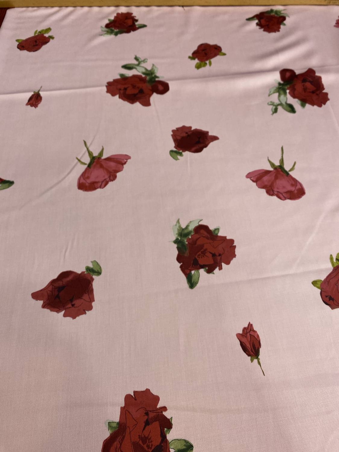 Málnapiros alapon fehér pöttyös olasz viszkóz flokon4480 FtOlasz viszkóz flokon- rózsa mintás, jó esésű