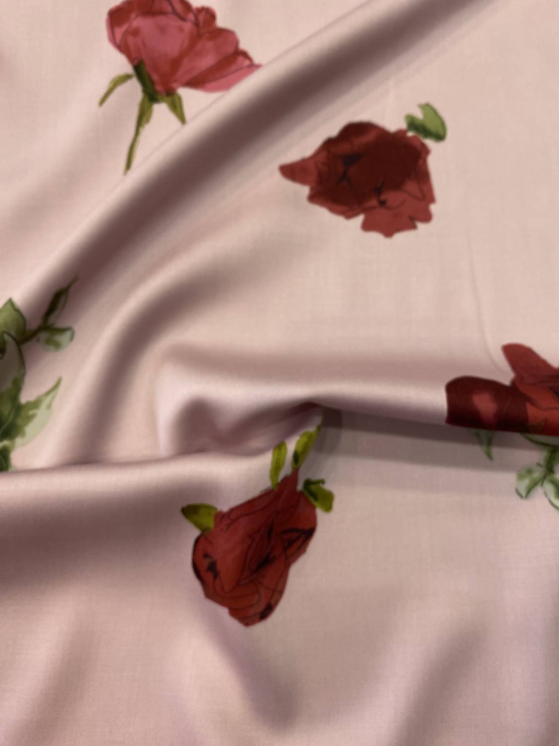 Selymes tapintású, lágy esésű viszkóz flokon, amely könnyű és elegáns megjelenést biztosít. Az elefántcsont árnyalatú alapon elszórtan elhelyezkedő élénkpiros rózsamotívumok finoman romantikus, nőies hangulatot teremtenek, miközben a kelme kellemes viseletet nyújt.