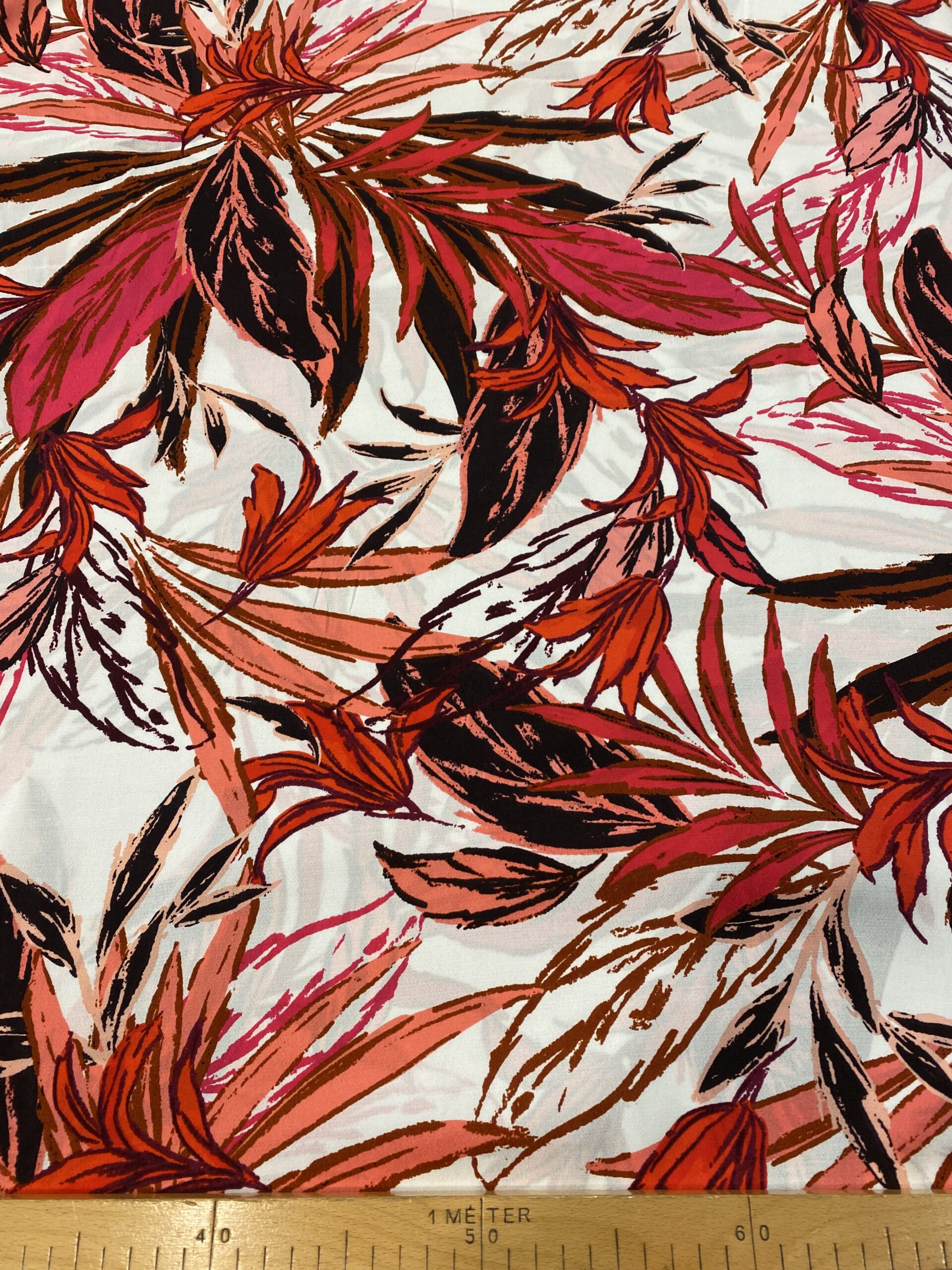 Finom, világos alapon nyomott levélmintás viszkóz muszlin zsorzsett élénk narancs, málna, púder és barna árnyalatokkal. A könnyed, lágy esésű anyag elegánsan követi a test vonalát, miközben levegős, nyári komfortérzetet biztosít. A zsorzsett jelleg enyhén szemcsés felületet ad, amely még karakteresebbé teszi a mintát.