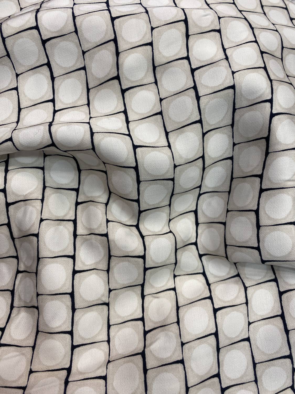 Modern hatású, könnyű viszkóz flokon apró  kocka- és pontmotívumokkal. A törtfehér alapot grafikus fekete vonalak tagolják, amelyek strukturált, mégis játékos megjelenést adnak az anyagnak. Puha, lágy esésű textil, amely kiválóan mozog a testen.