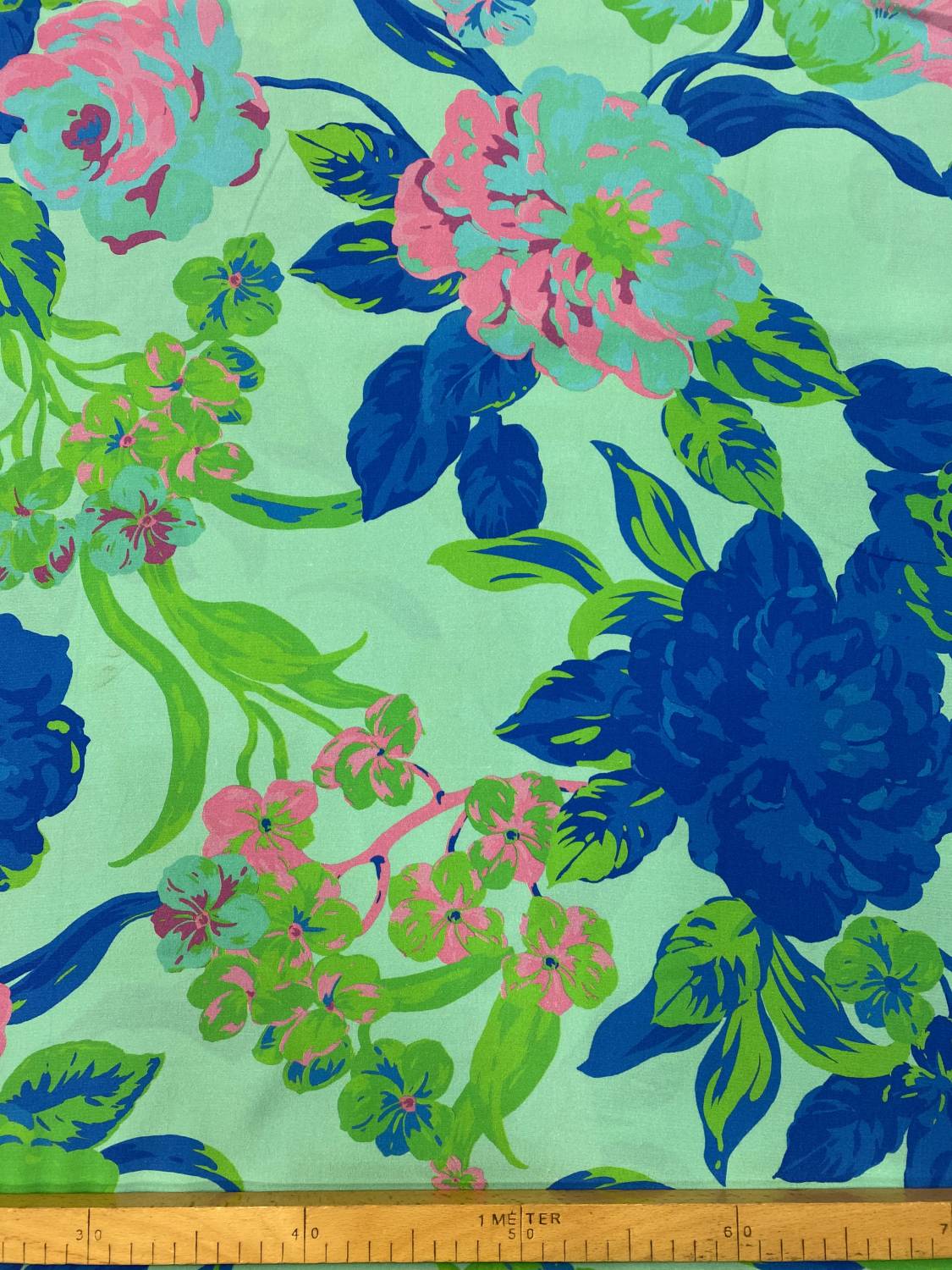 Friss, élénk türkiz alapon megjelenő nagyméretű pünkösdirózsa és stilizált virágkompozíció teszi ezt a viszkóz flokon anyagot igazán feltűnővé; lágy esésű, kellemes tapintású, könnyed, mégis karakteres megjelenésű textil, amely vibráló színeivel azonnal magára vonzza a tekintetet.
