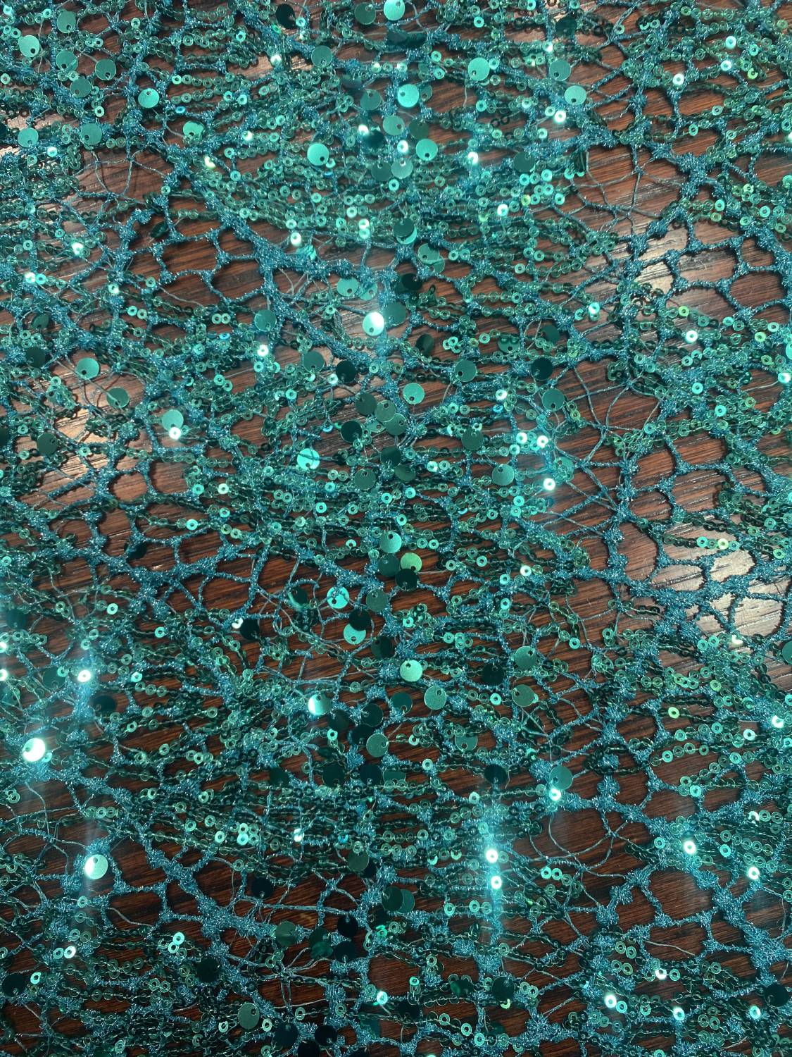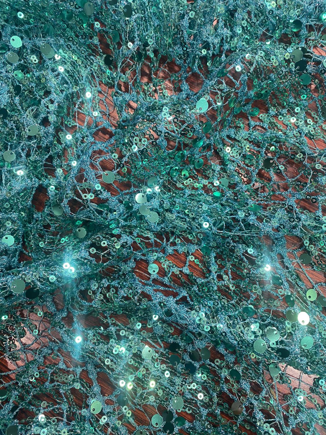 Különleges megjelenésű olasz csipke alapú textil, gazdagon flitterezett felülettel, amely elegáns fényt és látványos textúrát biztosít; könnyű, mégis dekoratív, exkluzív karakterű anyag, amely kiemelkedő alkalmi ruhadarabokhoz ideális választás.