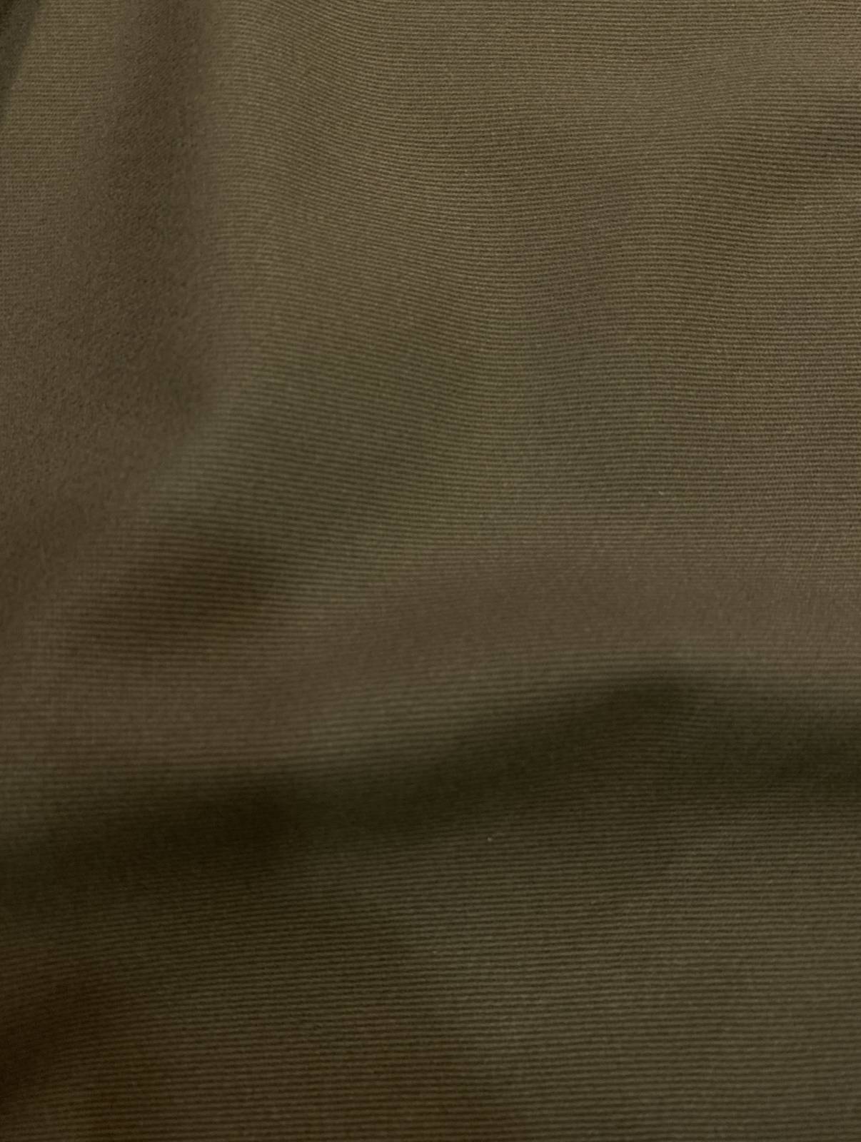 Vastag, meleg khaki színű, sávolyos szövésű elasztikus pamutvászon, természetes tapintású, stabil tartású, ugyanakkor rugalmas anyag, amely jól bírja a mindennapi igénybevételt. A sávolykötés finom ferde struktúrája karaktert ad az anyagnak, miközben megőrzi a letisztult felületet.