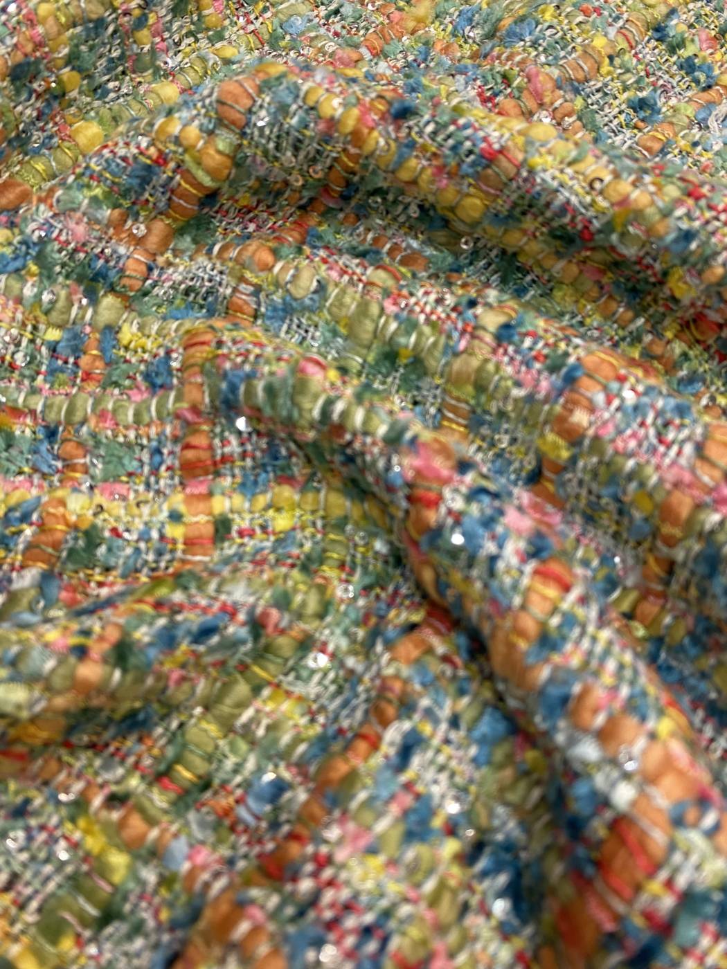 Ez a különleges Chanel-stílusú bouclé szövet friss zöldes alapra épülő meleg narancsos, sárgás és türkizes árnyalataival igazán élő, vibráló felületet alkot. A csillogó lurex szálak finom fényt adnak az anyagnak, míg a noppos beszövések gazdag, térbeli struktúrát teremtenek. Közepes vastagságú, jó tartású textil, amely egyszerre játékos és elegáns.