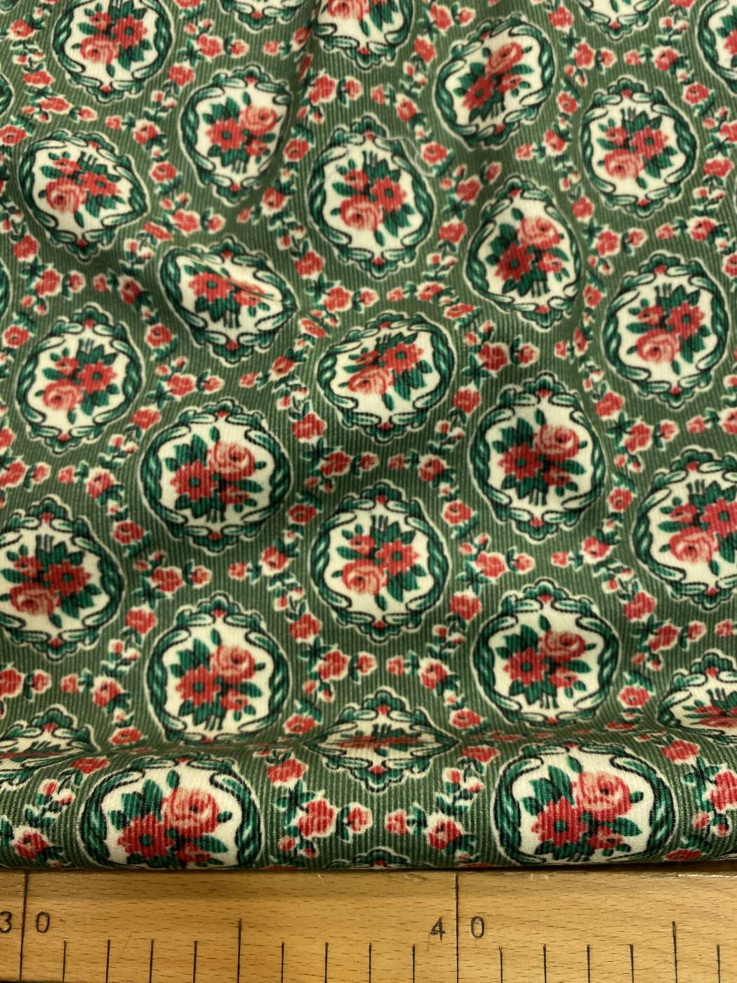 Prémium minőségű, finom bordázatú, elasztikus kordbársony, klasszikus medalionos elrendezésű virágmintával. A csíkos hatású, zöld alapot törtfehér keretbe foglalt, korall- és piros tónusú rózsacsokrok díszítik, apró virágmotívumokkal gazdagítva. A minta elegáns, kissé nosztalgikus, mégis friss, modern színösszhatású.